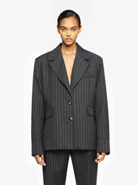- Relaxed fit tailored jacket with pinstripe design details - Oversized shoulders - Open back slit with tie closure - Dual button closure - Fully lined - Relaxed fit, take your usual size Additional Information - Colour: Mid Grey Melange - Composition: 100% Wool - Mid-weight wool fabrication - Made in: Italy - SKU: JK0368PG1695945