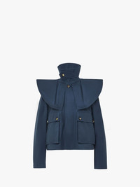 - Featured on the Runway - Cropped A-line style jacket with high-neck design - Oversized layered collar - Horn-buttons - Dual oversized flap pockets - Unlined - Relaxed fit, take your usual size Additional Information - Colour: Light Indigo - Composition: 100% Cotton - Mid-weight waxed cotton fabrication - Made in: Bulgaria - SKU: JK0366PG1683770