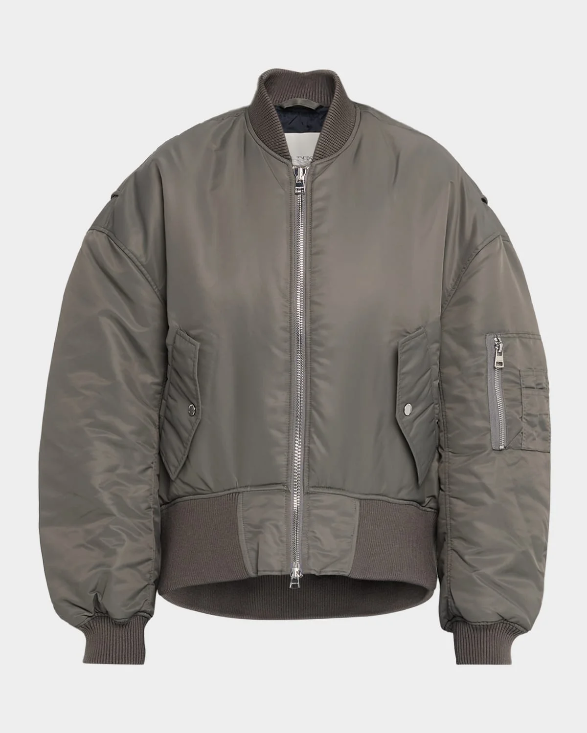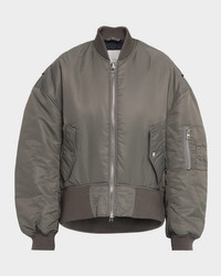 - Presented in a unique curved silhouette, this bomber jacket by JW Anderson is framed with dropped shoulders - Baseball collar; two-way zipper - Long sleeves - Side flap pockets with snap closures - Ribbed cuffs and hem - Oversized fit - Hip length - Nylon/polyamide - Imported