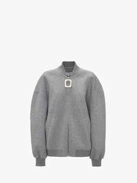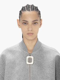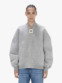 - Relaxed fit bomber jacket - White signature JWA puller - Dropped shoulder - Tonal ribbed collar, hem and cuff - Side welt pockets - Small logo embossed black leather patch - Silver tone hardware - Unlined - Double face wool construction - Fits large to size, take one size smaller than normal.