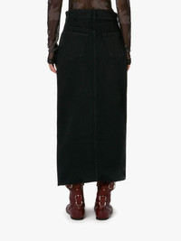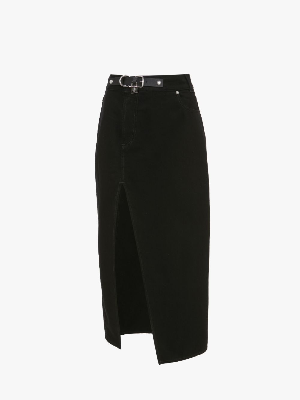- Straight fit long denim skirt - Floor length - High slit detail - Asymmetric closure - Anchor profile stitch on back pocket - Silver tone padlock detail on removable leather strap - Fits true to size, take your normal size. Additional Information - Colour: Black - Composition: 100% Cotton - Washed / soft handfeel - Twill - Rigid (non stretch) - Made in Italy