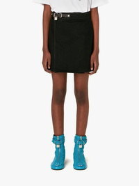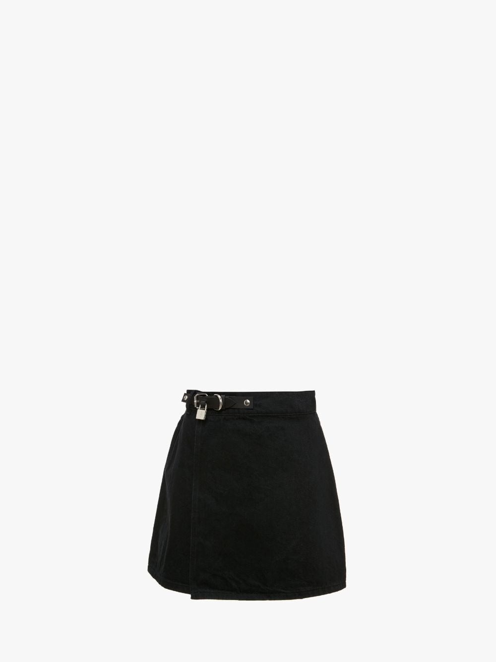 - A line mini skirt - Mini length - Wrap over construction - Anchor profile stitch on back pocket - Silver tone padlock detail on removable leather strap - Fits true to size, take your normal size. Additional Information - Colour: Black - Composition: 100% Cotton - Washed / soft handfeel - Twill - Rigid (non stretch) - Made in Italy