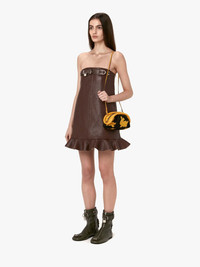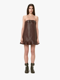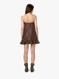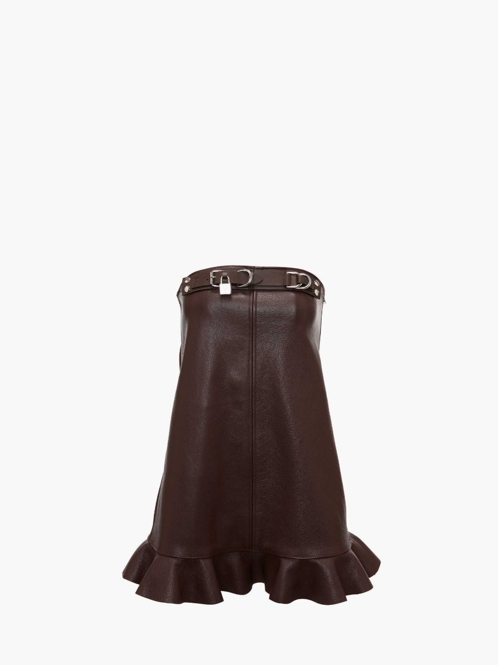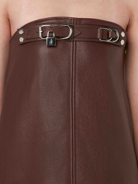 - A-line silhouette leather bustier dress - Mini length - Flared ruffled heml - Silver padlock detail on removable leather strap - Internal bodice - Unlined - Side zip closure - Fits true to size, take your normal size. Additional Information - Colour: Chocolate Brown - Composition: 100% Cow Leather - Textured grain - Made in Italy