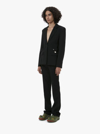 - Straight fit single breasted blazer - Flap pockets - Removable padlock tab detail on sides - Centre crease on sleeve - Contrast buttons - Silver tone hardware - Back vent - Fully lined - Fits true to size, take your normal size. Additional Information - Colour: Black - Composition: 95% Virgin Wool, 5% Elastane - High shine - Cold dyed - Made in Italy