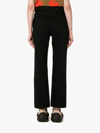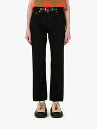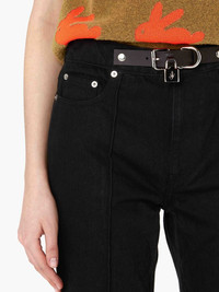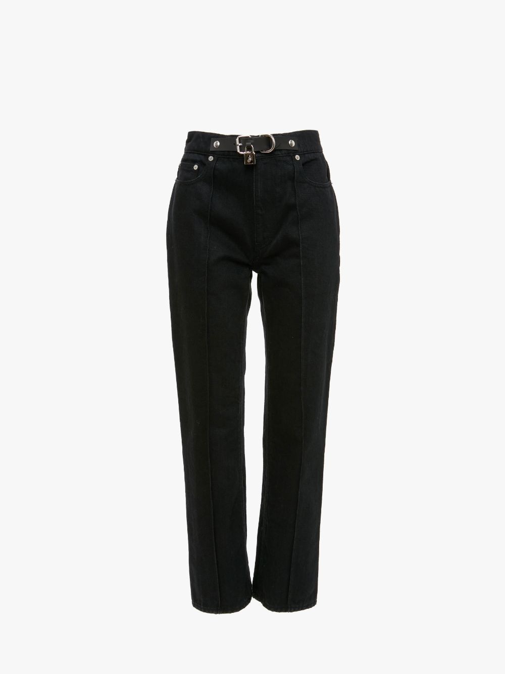 - Mid waist denim jeans - Straight fit - Cropped leg - Silver padlock detail on removable leather strap - Pin tuck detail - Anchor profile stitch on back pocket - Silver tone hardware - Fits true to size, take your normal size. Additional Information - Colour: Black - Composition: 100% Cotton - Washed / soft handfeel - Twill - Rigid (non stretch) - Made in Italy