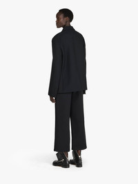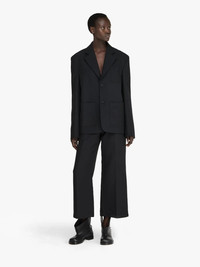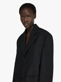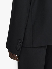 - Tailored blazer jacket complete with patch pocket design - Self covered buttons - Fully lined - Relaxed fit - take your usual size Additional Information - Colour: Black - Composition: 77% Viscose, 23% Polyamide - Double Woven Viscose Fabrication - Made in: Romania - SKU: JK0379PG1679999
