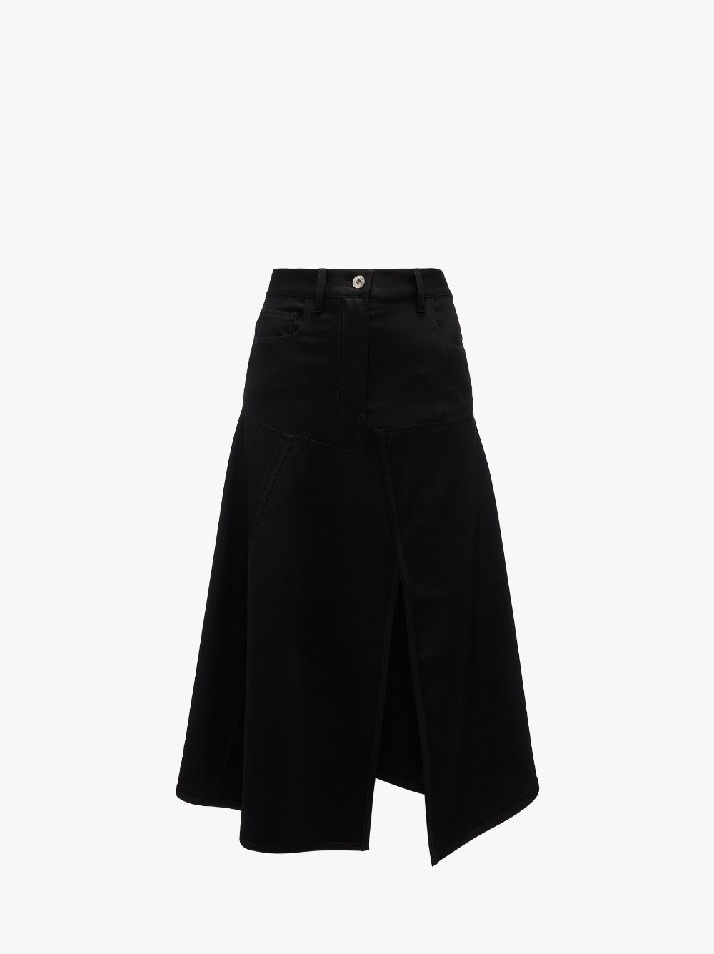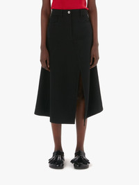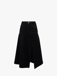 - A-line asymmetric skirt - Flared silhouette - Denim waistband - Deconstructed seams - Front opening - Silver hardware Additional Information - Colour: Black - Composition - Main: 100% Sheep wool - Twill construction - Made in Italy