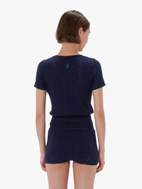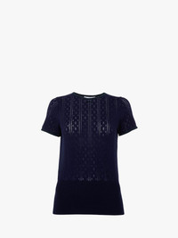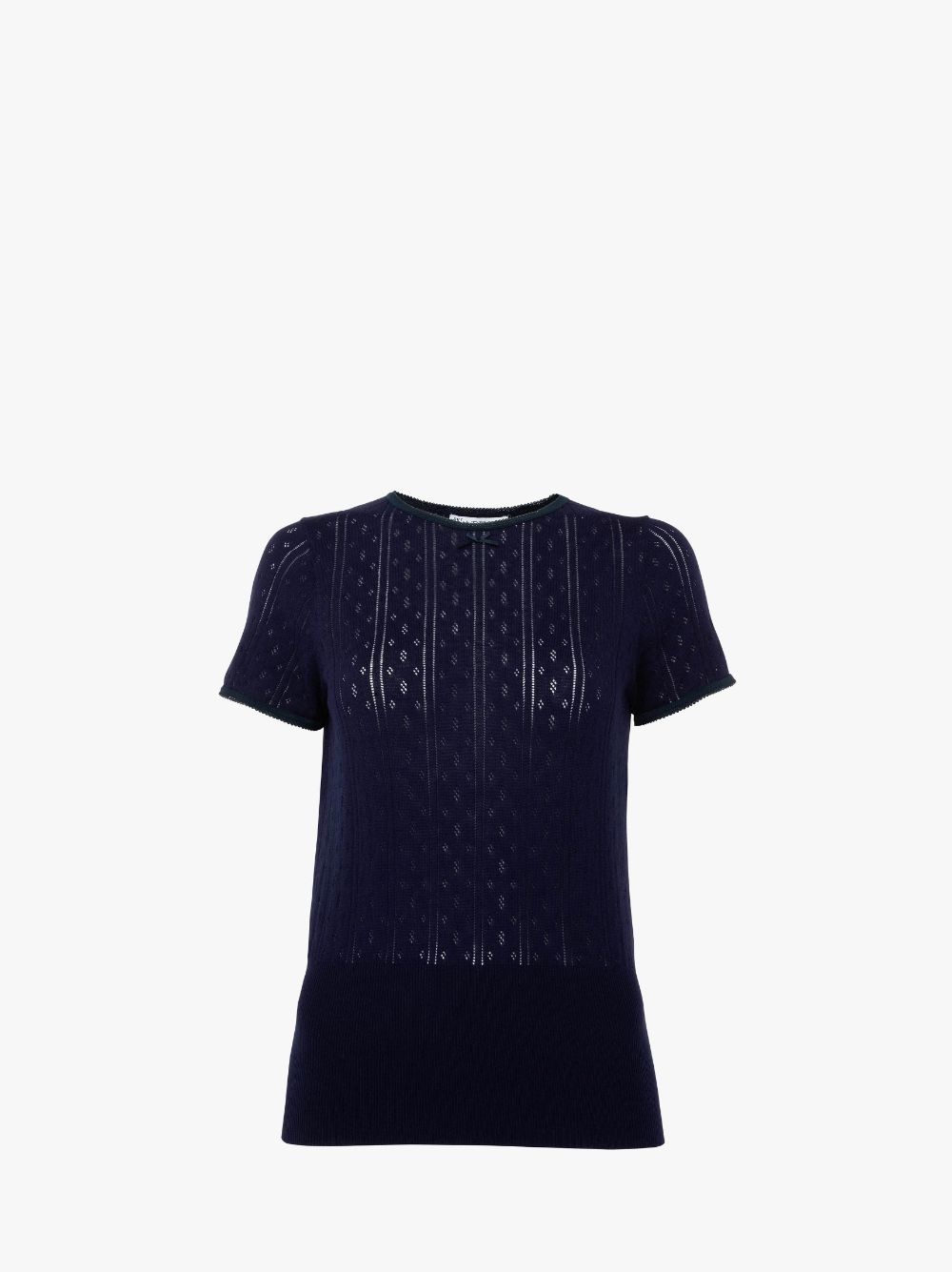 - Knitted cap-sleeve top complete with finished edging - Pointelle Stitching, and deep ribbed hemline - Contrasting coloured branded Anchor embroidery - Small bow detailing - Fitted silhouette, take your regular size Additional Information - Colour: Navy - Composition - Main: 95% Cotton, 5% Cashmere - Lightweight pointelle knit fabrication - Cashmere blend - Made in China - SKU: KW1276YN0389888