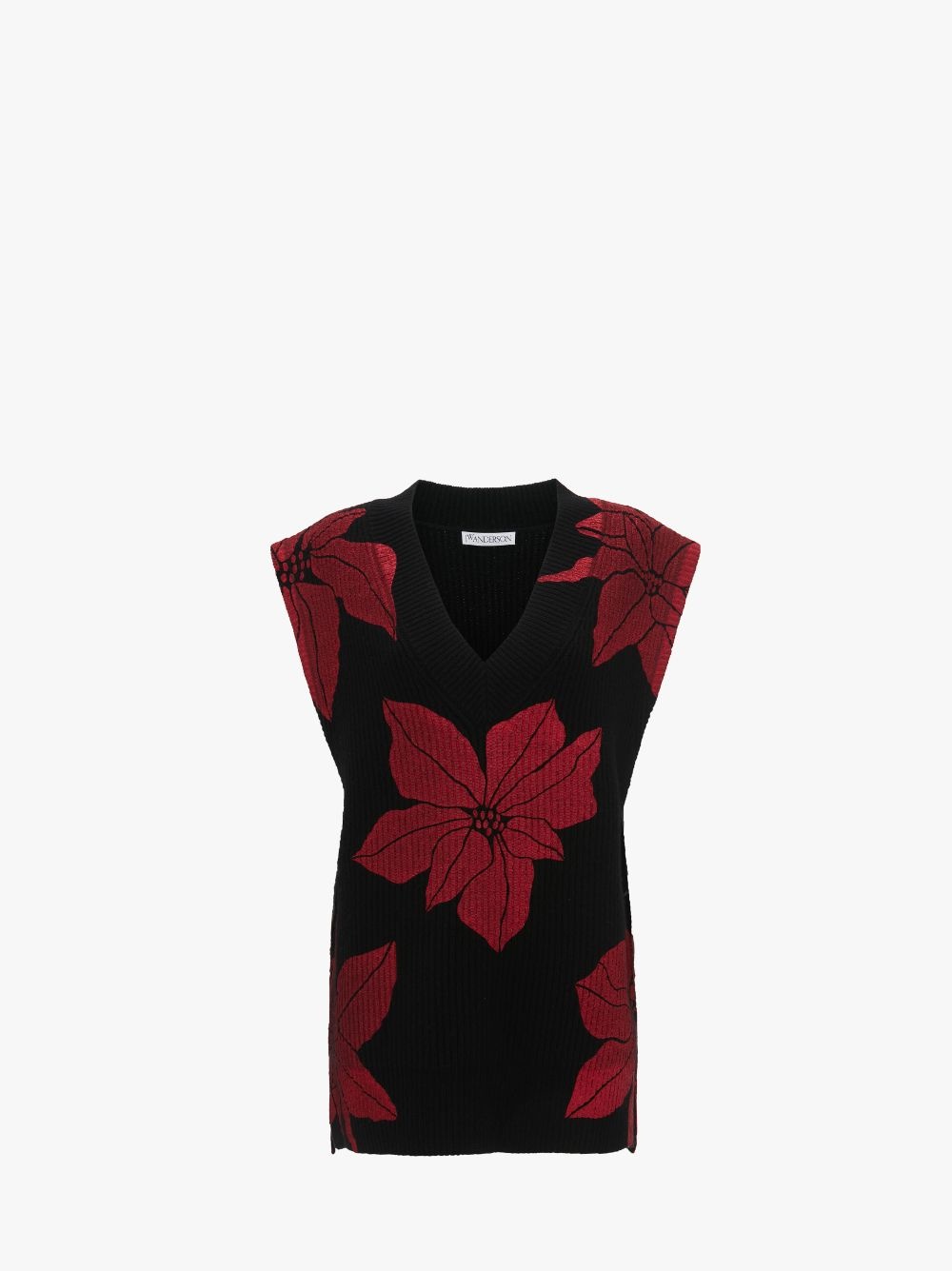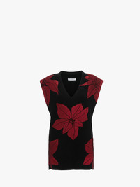 - V neckline vest with rubberized Poinsettia print - Side slits - Boxy fit - take your usual size Additional Information - Colour: Black - Composition - Main: 96% Merino wool, 3% Polyamide, 1% Elastane - Heavy weight - Made in China