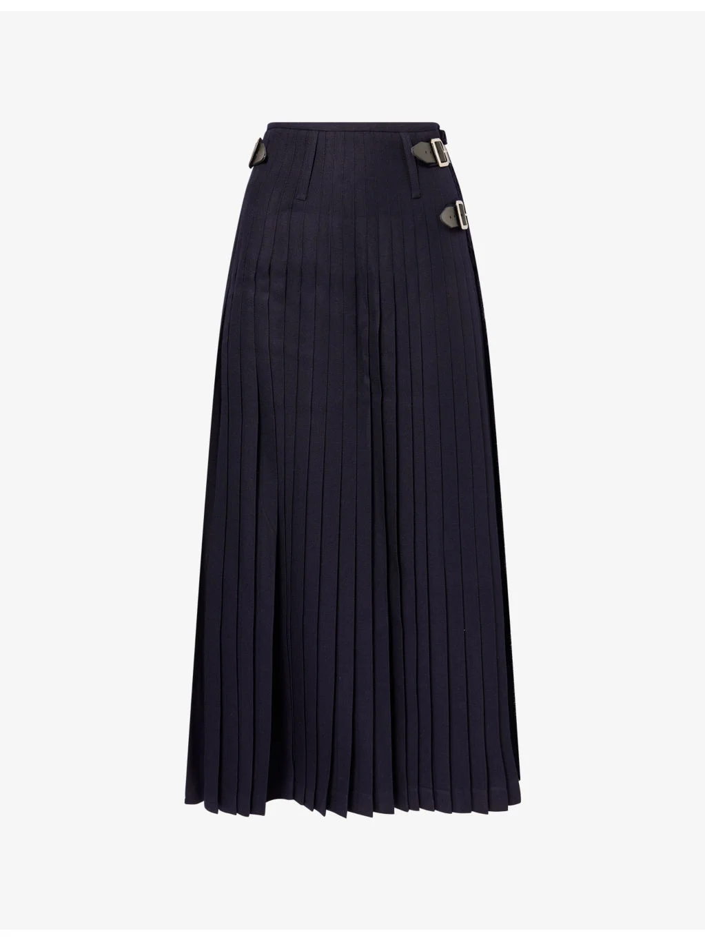 PRODUCT DETAILS - JW Anderson wool kilt - 100% wool - Adjustable buckle fastening - Regular fit, maxi length, mid-rise, wrap-around, two adjustable buckles at side, one fixed buckle at side, frayed edge at side hem, all-over pleating at back, leather brand patch at front, flat front piece - Dry clean - Made in Scotland - True to size - Size UK 8: length 41.5in / 105.4cm - Model is 5ft 10in/1.78m and wears a size UK 8 - Heavyweight, non-stretch Ref: R04569605
