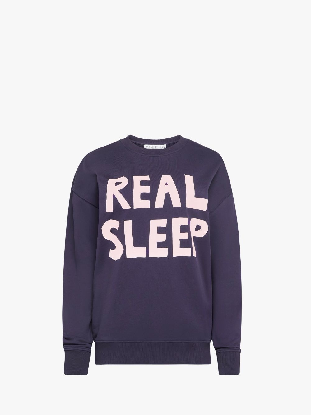 - Jersey sweatshirt with "Real Sleep" slogan print - Dropped shoulder - Ribbed crew neckline, cuff and hem - Contrasting branded Anchor embroidery on centre back panel - Classic fit - take your usual size Additional Information - Colour: Dark Navy - Composition: 100% Polyamide - Heavy-weight jersey fabrication - Made in: Portugal - SKU: JW0230PG1632898