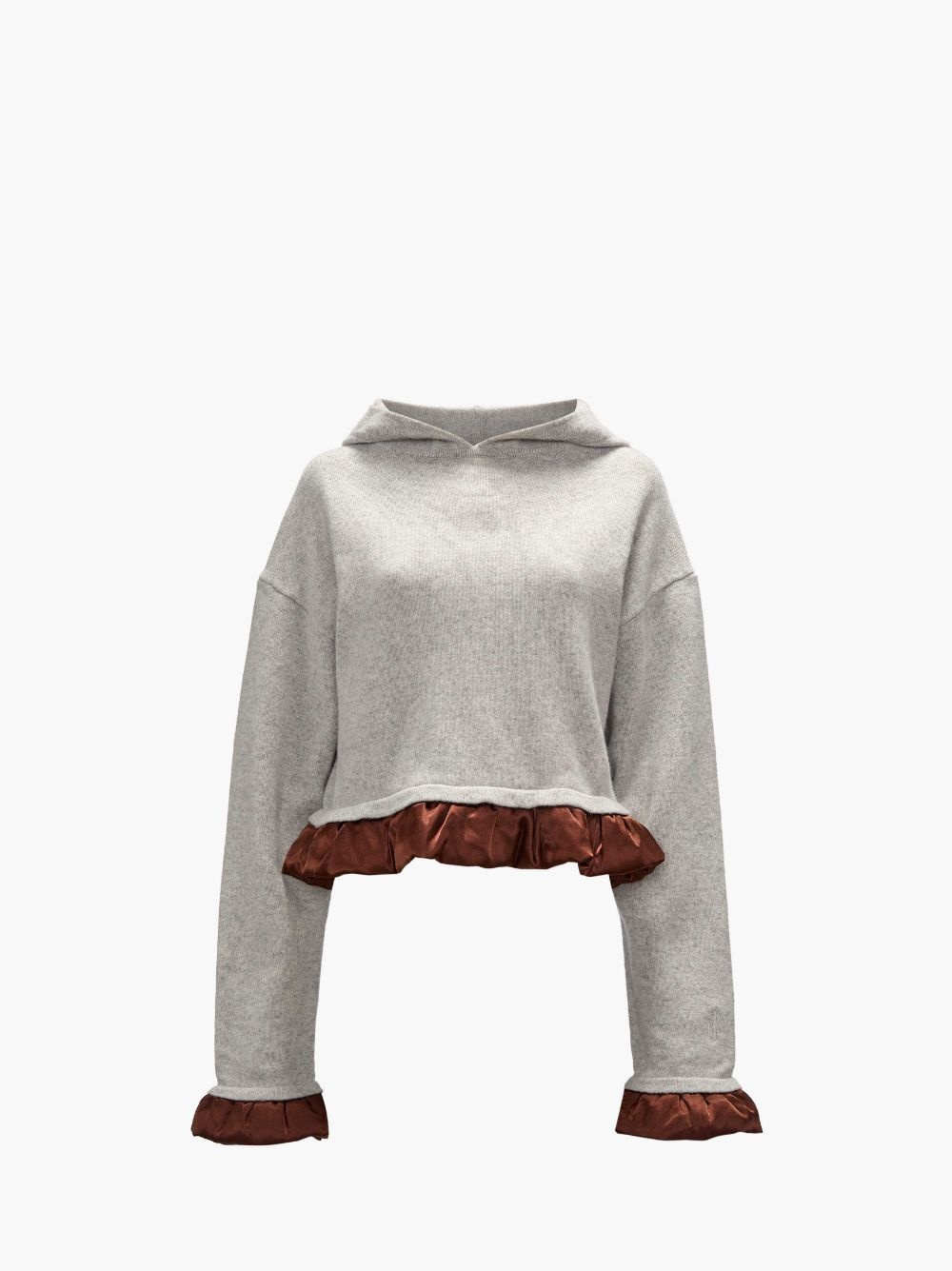 - Cropped, knitted hoodie with satin trim details - Relaxed fit - Cropped length - Contrast satin gathering on hemline and cuffs - Tonal anchor detail on left cuff - Oversized style Take your usual size Additional Information - Colour: Light Grey - Composition - Main: 100% Merino Wool - Contrast: 100% Polyester - Made in China - Fine knit