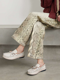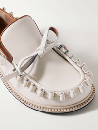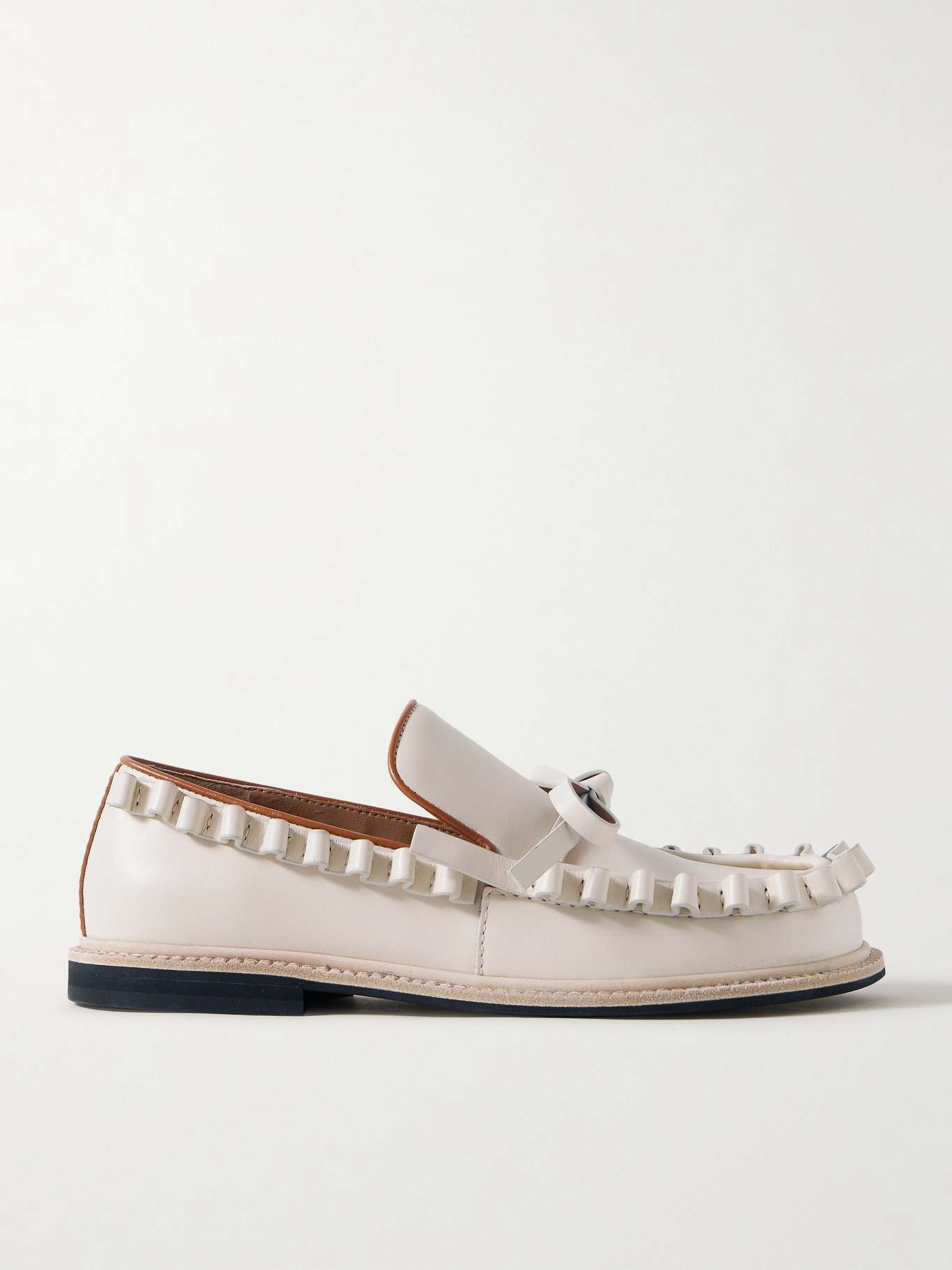 EDITORS'NOTES Traced with structured, dimensional ruffles, JW Anderson's loafers are a fresh, unexpected take on the classic. They've been made in Italy from smooth leather and topped with neatly tied bows. SIZE & FIT - Fits true to size, take your normal size - Italian sizing DETAILS & CARE - Heel measures approximately 15mm/ 0.5 inches - Off-white and brown leather (Calf) - Slip on