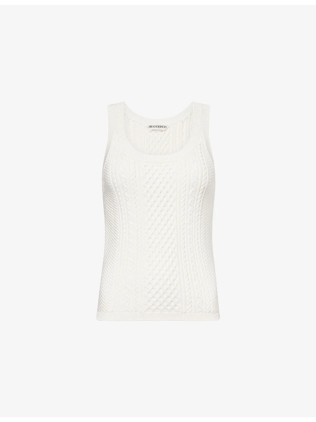 PRODUCT DETAILS - JW Anderson cable-knit tank top - 83% viscose, 17% polyester - Regular fit, round neck, sleeveless, shoulder straps, all-over cable knit, ribbed trims - Dry clean - Made in Italy - True to size - Model is 5ft 10in/1.78m and wears a size small - Midweight, stretchy Ref: R04569603