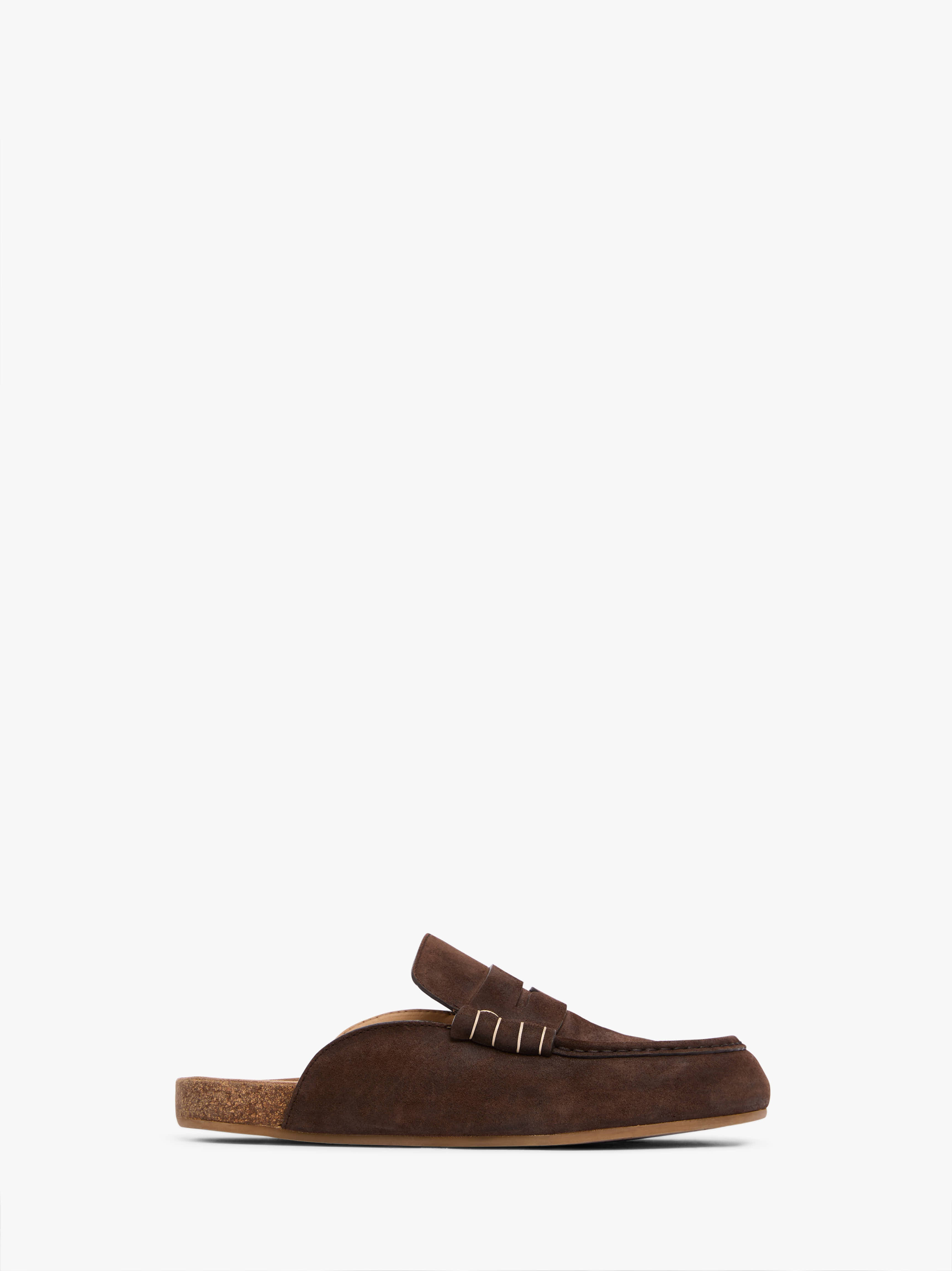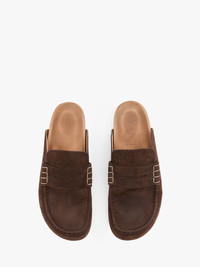 - Loafer mules complete in a smooth suede fabrication - Calf leather front band and binding - Rounded toe - Wide fit style, if in-between sizes, take one size smaller than normal Details - Colour: Deep Walnut - Composition: 100% Calf Suede - Sole: 100% Rubber - Heel Height: 15mm - Textured Suede Fabrication - Made in: Italy - SKU: LF0078LA0319631