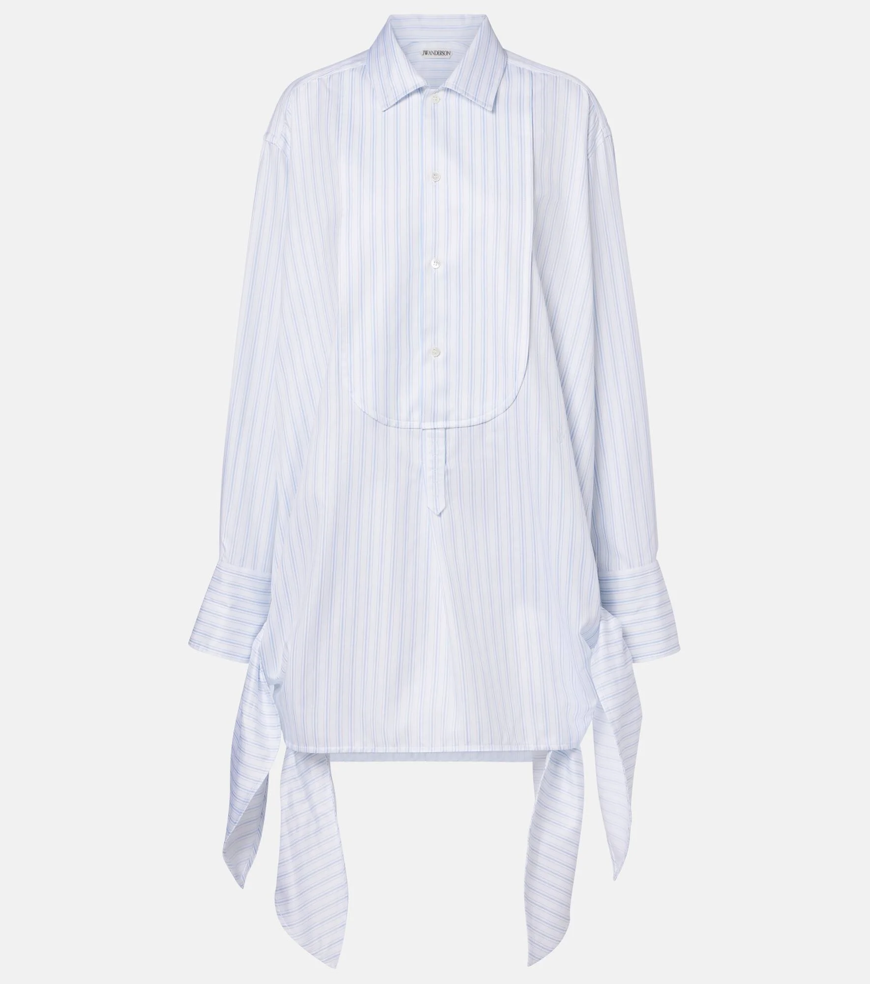 From casualwear to tailoring, JW Anderson marries modernity with style in every design. Made from pure cotton, this flowy minidress features a shirt-inspired silhouette, a striped print, and bow details on the sides. Product Details - Material: 100% cotton - Care instructions: dry clean - Made in Italy - Color: white - Designer color name: White/Blue - Vent: double - Closure: partially buttoned front - Contains non-textile parts of animal origin - Collar: classic (Straight point) - Cuff: three buttons - Hem: uneven - Item number: P01123941 Size & Fit - True to size - Dropped shoulders - Designed for a loose fit - Non-stretchy fabric - The model seen in the picture is 178cm-5'10" and wearing a size UK 6