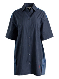 striped shirt mini dress Highlights - Steel blue - Vertical stripes - Short sleeves - Button fastening - Panelled design - Straight hemline Imported Composition Fabric 100% Washing instructions Read Manufacturer Guidelines