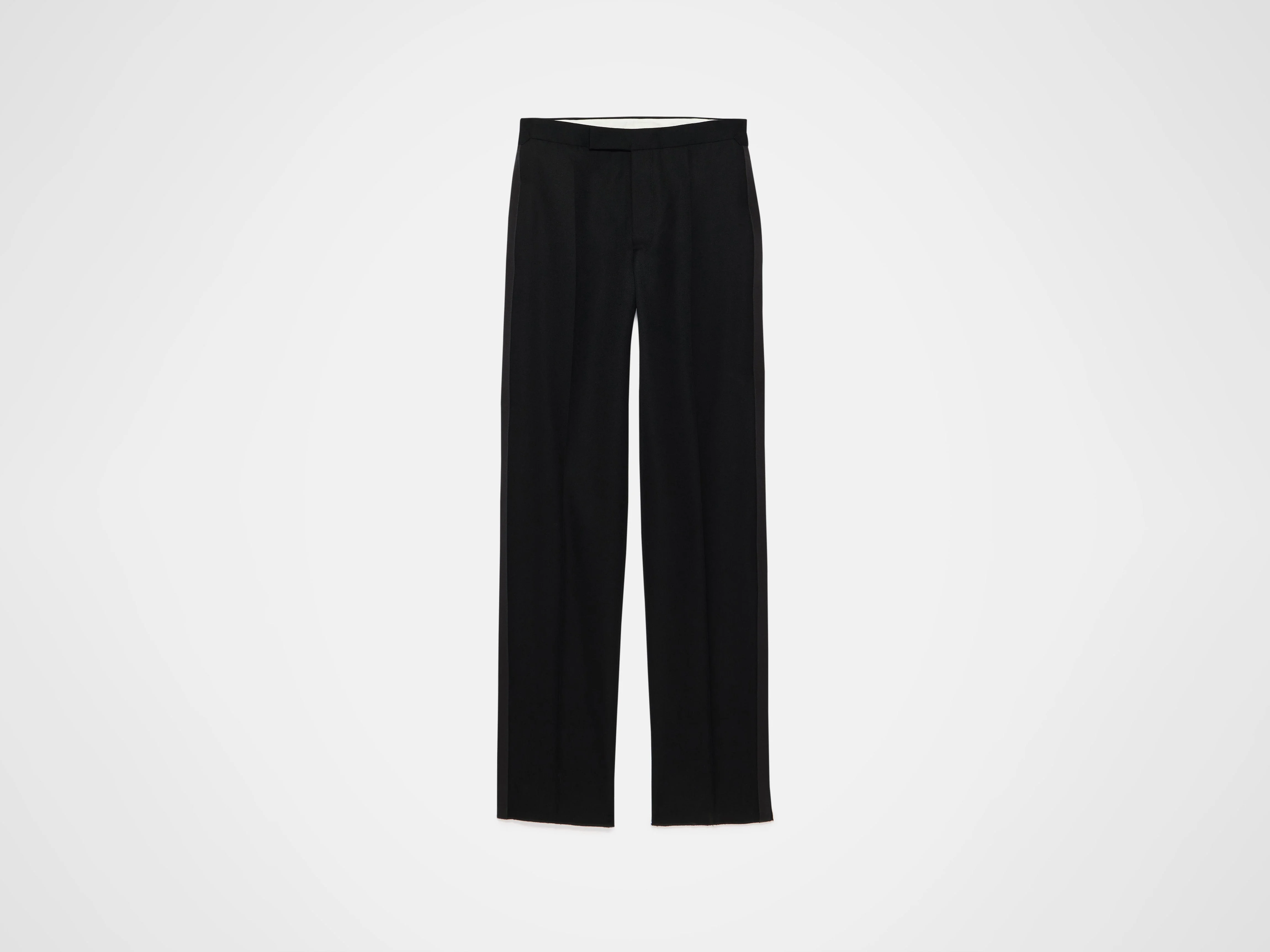 Tailored tuxedo trousers in black, in a straight leg silhouette. Featuring silk grosgrain stripes down the legs, logo waist-banding and zip fly. Finished with self covered buttons. Details - Colour: Black - Composition [Main]: 100% Wool - Composition [Contrast]: 100% Silk - Composition [Lining]: 100% Cupro - Made in: Italy - Model [Wears]: Size 6, 180cm Tall - SKU: TR0416PG1883999