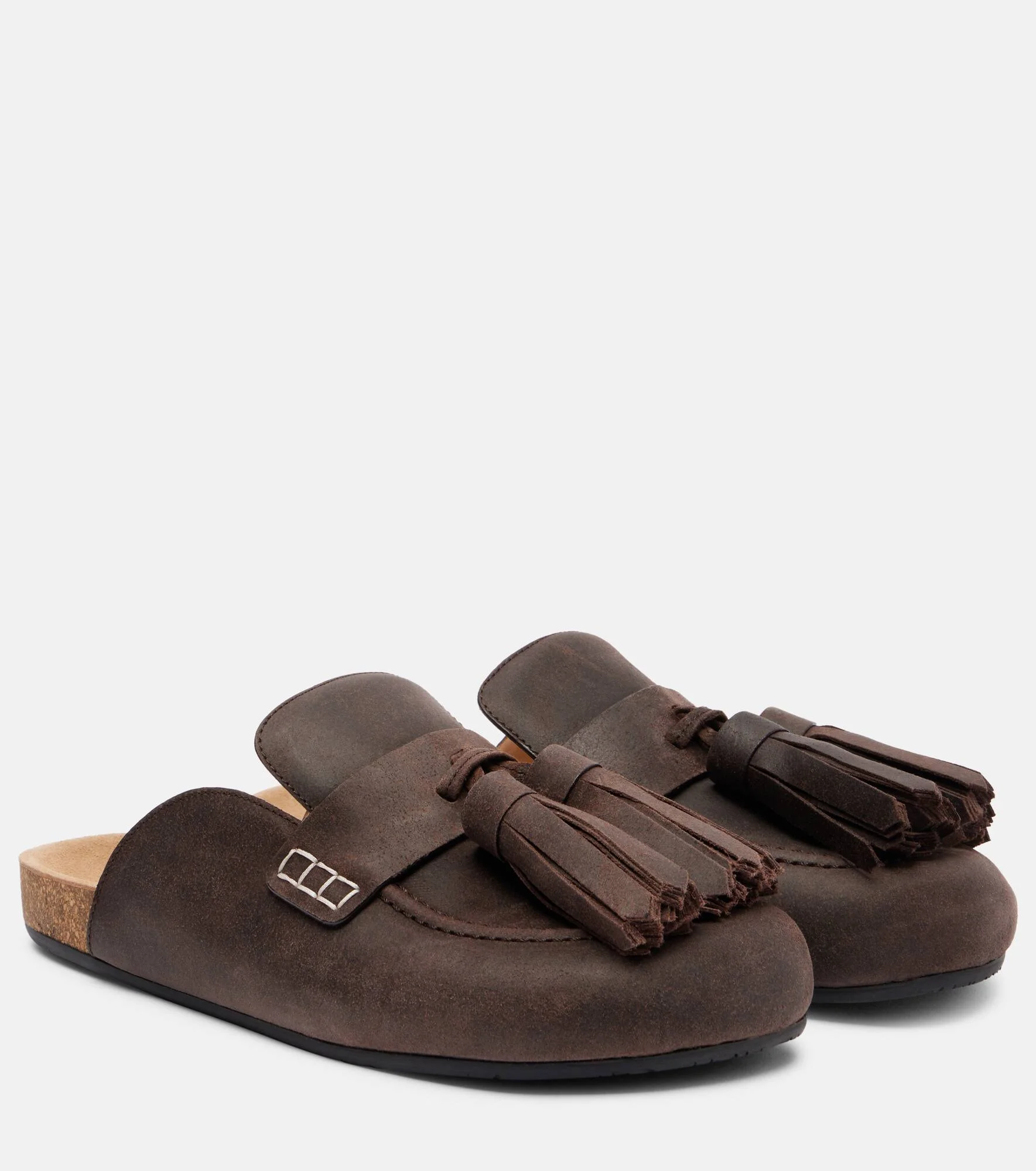 From casualwear to tailoring, JW Anderson marries modernity with style in every design. The Tassel mules are crafted from soft suede and finished with playful tassels on the uppers: an eye-catching detail that gives the pair its name. Product Details - Upper: calf leather - Lining: leather - Sole: leather insole, cork and rubber sole - Toe shape: round toe - Made in Italy - Includes: shoe box - Designer color name: Deep Walnut - Item color: brown - Item number: P01086807 Size & Fit - True to size - European sizes - 2cm-1" platform (size EU 38)