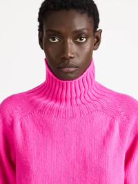 Turtleneck jumper in neon pink medium weight knit. Features 'JW Anderson made in Scotland' embroidery on the sleeve, finished with rib trims. Details - Colour: Neon Pink - Composition [Main]: 100% Wool - Made in: United Kingdom - Model [Wears]: Size S, 180cm Tall - SKU: KW1523YN0451311