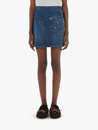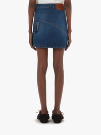 - Denim twisted mini skirt - Patchwork construction - Leather patch with logo embossed on the back - Anchor logo stitched on front pocket - Side zip closure - Silver hardware - Fits true to size - take your usual size