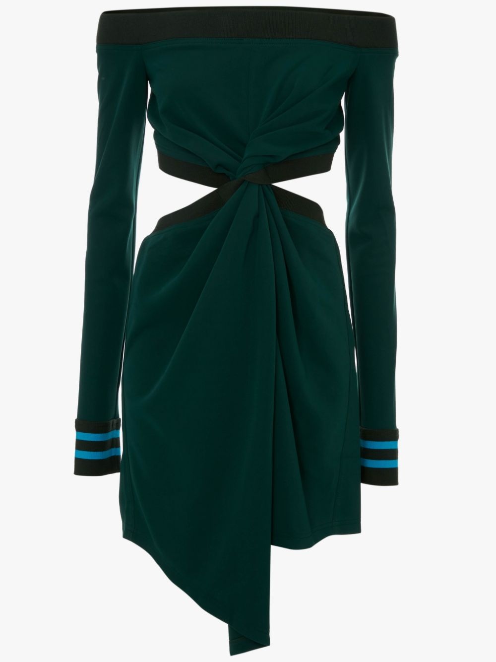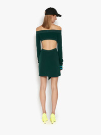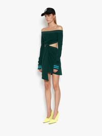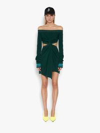 - Off the shoulder mini dress - Fitted silhouette - Mini length - Twisted open waist - Ribbed details - Fits true to size, take your normal size. Details - Colour: Forest Green - Composition: 100% Polyester - Slight grainy surface appearance - Fluid drape - Fabric from Japan