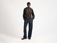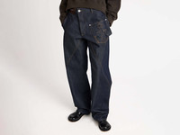 Crafted in Hiroshima, Japan, developed in collaboration with expert Japanese denim makers. Twisted workwear denim jeans in indigo. Features a large leather logo patch, anchor stitched pocket. Finished with engraved metal shank buttons, logo rivets and orange binding. Details - Colour: Indigo - Composition [Main]: 100% Cotton - Composition [Lining]: 100% Cotton - Made in: Japan - Model [Wears]: Size 27, 180cm Tall - SKU: DT0127PG1930870