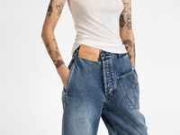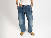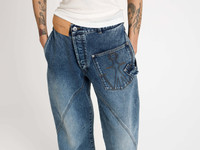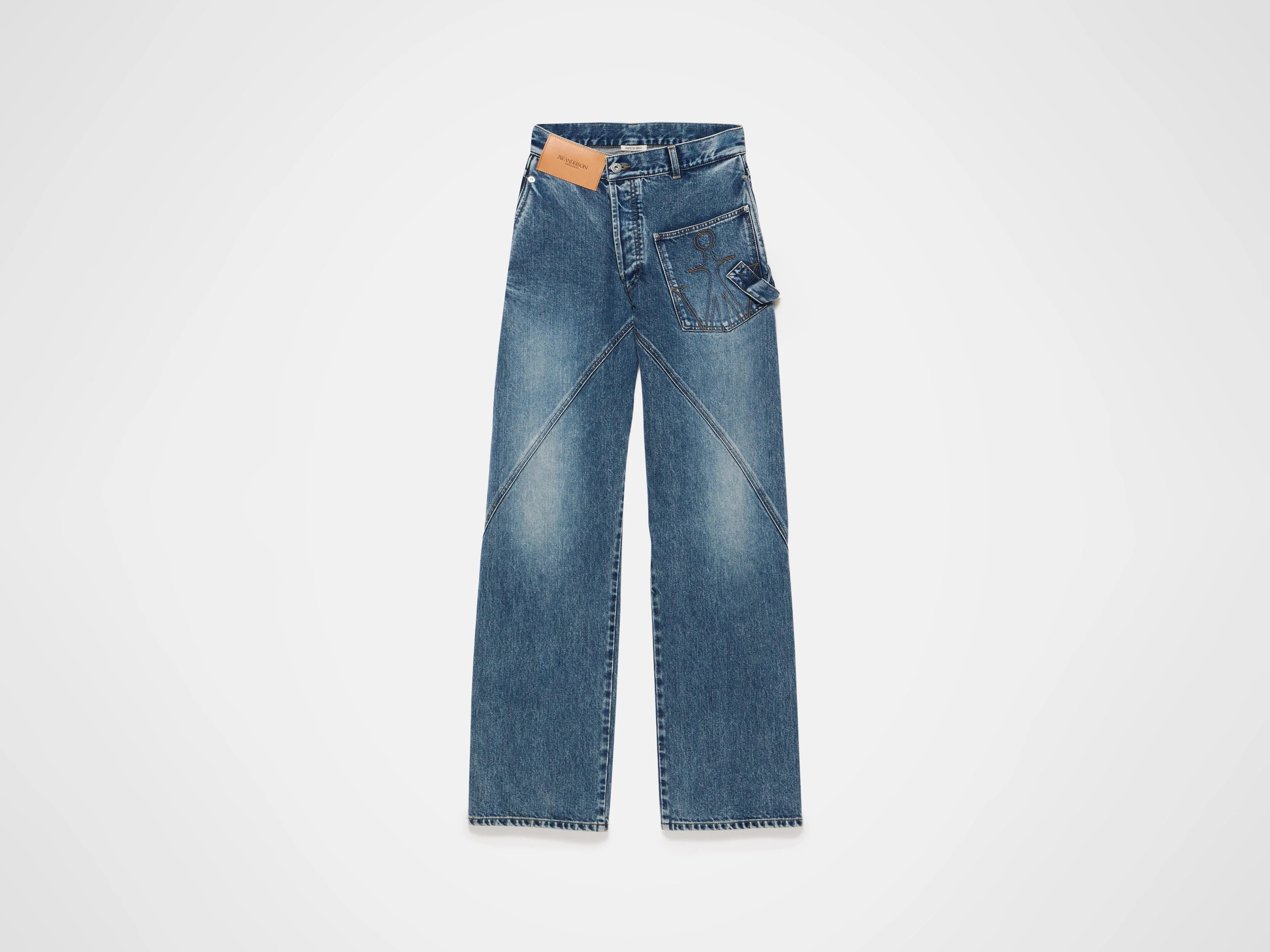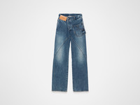 Crafted in Hiroshima, Japan, developed in collaboration with expert Japanese denim makers. Twisted workwear denim jeans in mid blue. Features a large leather logo patch and anchor stitched pocket. Finished with engraved metal shank buttons, logo rivets and orange binding. Details - Colour: Mid Blue - Composition [Main]: 100% Cotton - Composition [Lining]: 100% Cotton - Made in: Italy - Model [Wears]: Size 27, 180cm Tall - SKU: DT0127PG1849172