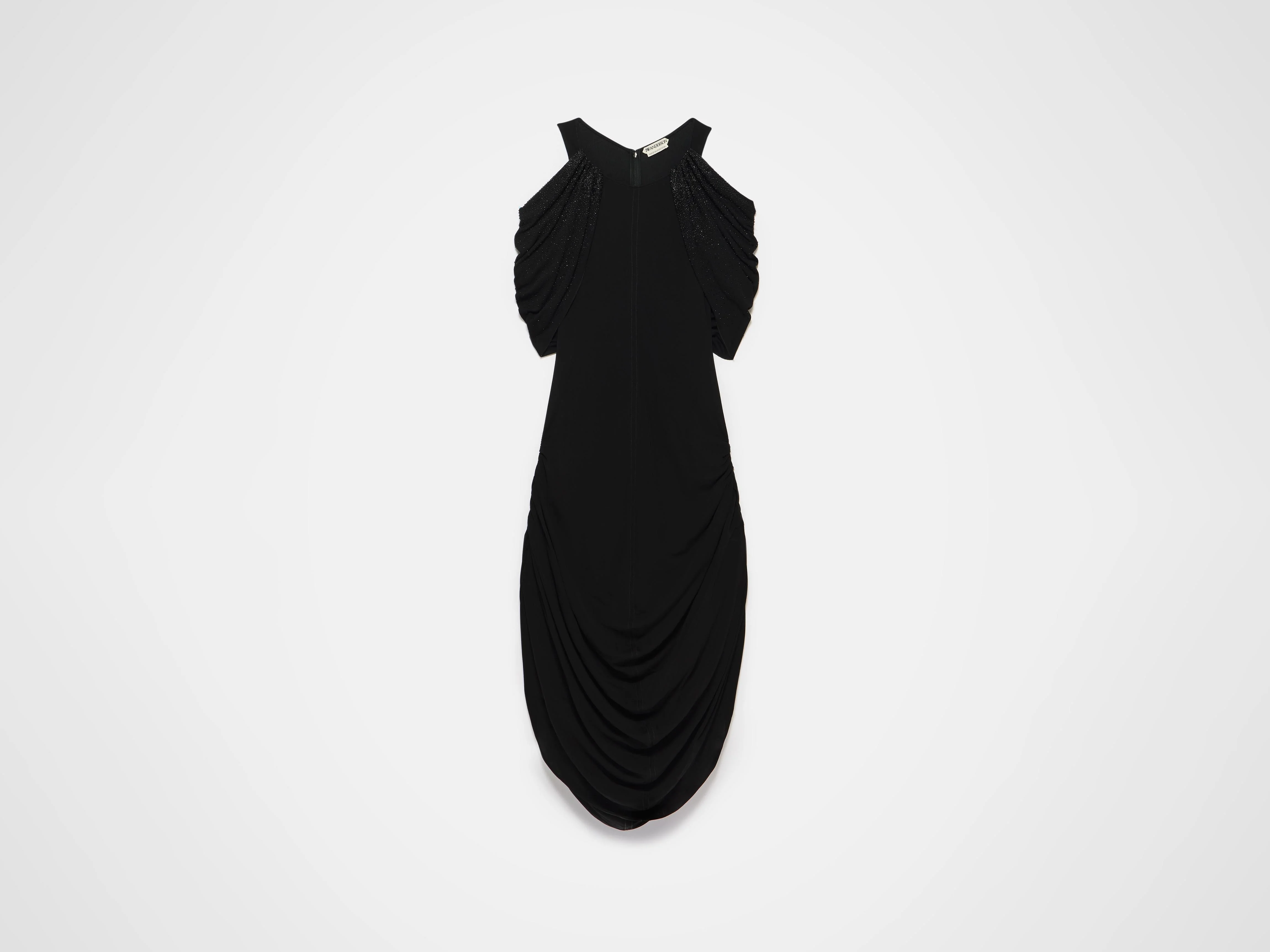 Evening dress in black crepe. Features a fluid, draped silhouette in midi length. Finished with handstitched crystals. Details - Colour: Black - Composition [Main]: 100% Viscose - Made in: Portugal - Model [Wears]: Size 8, 180cm Tall - SKU: DR0519PG1896999