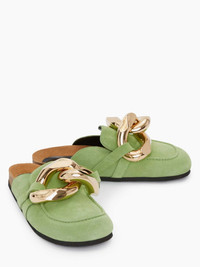 - Gold chain link detail embellishments - Slip on loafer mules - Rounded toe - Cork footbeds Details - Colour: Lime - Made in Italy - Upper: 100% Calf Suede - Lining: 100% Split Sheep Leather - Wide fit