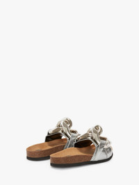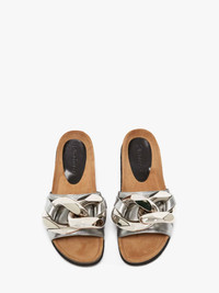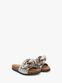 - Gold tone chain link detail embellishments - Rounded toe - Metallic leather - Cork footbeds - Slip on slides