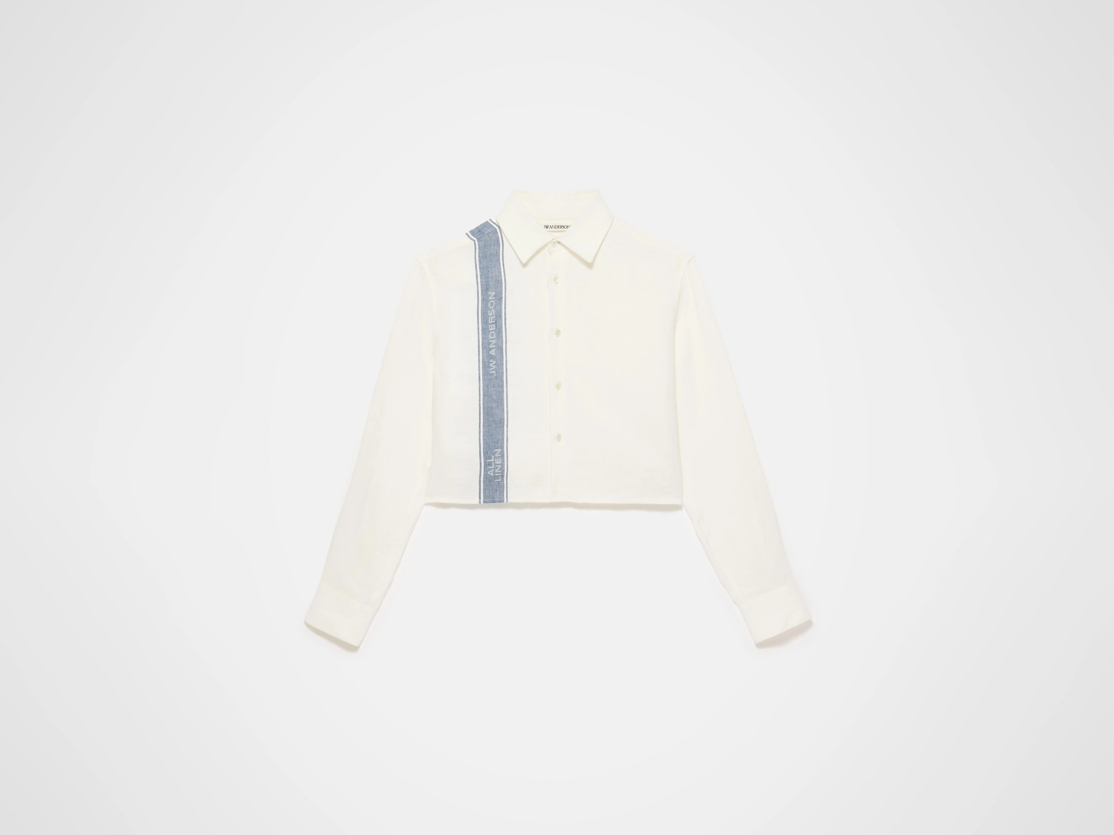 Shirt in off-white with blue contrast stripes, in the finest Irish linen. Features a cropped silhouette with anchor embroidered detailing in tonal thread. Finished with mother-of-pearl buttons. Details - Colour: Off White/Blue - Composition [Main]: 100% Linen - Made in: Italy - Model [Wears]: Size 8, 180cm Tall - SKU: SH0384PG1898614