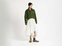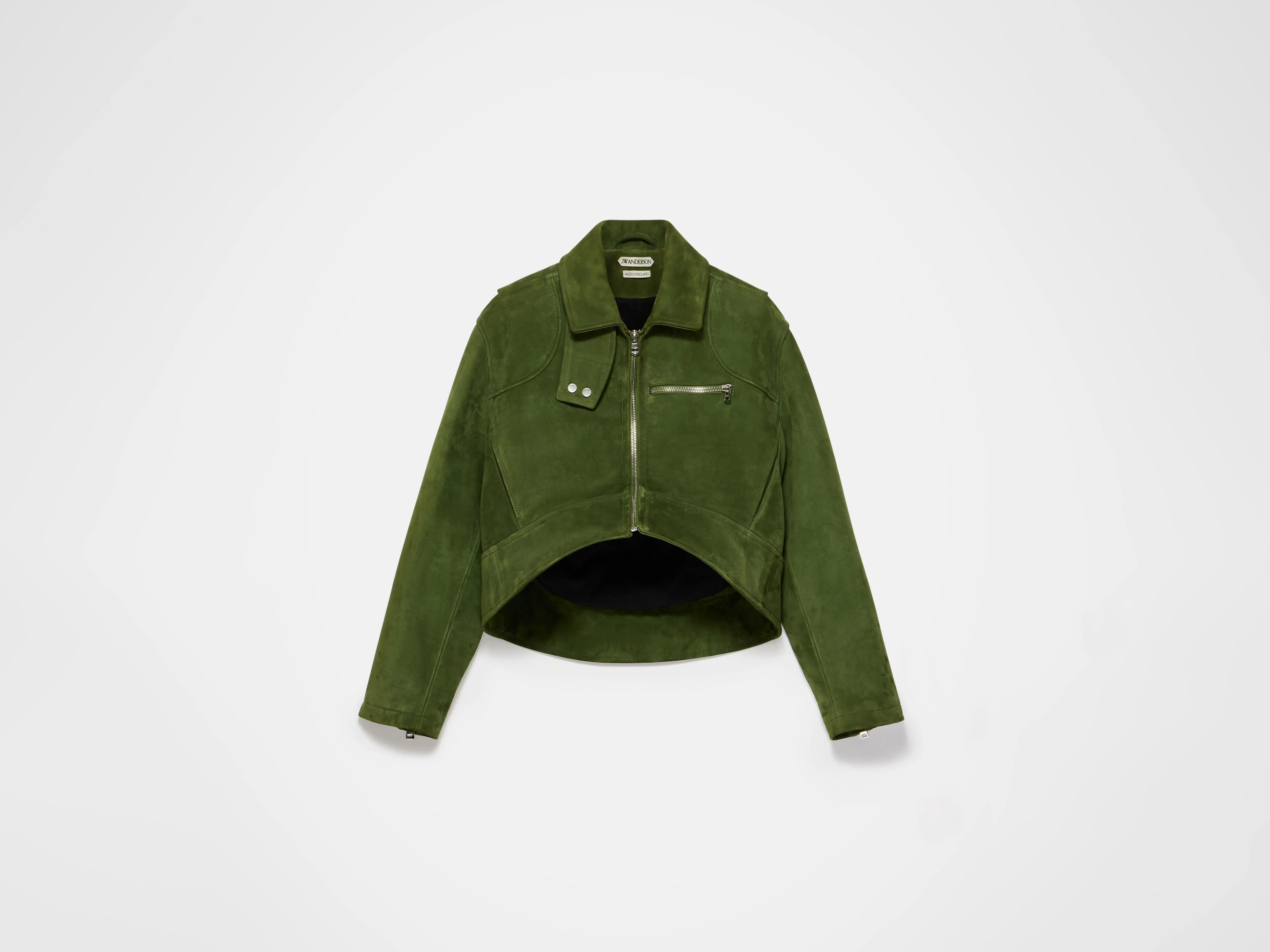 Khaki leather biker jacket in a cropped silhouette, with a curved, tipped hem and quilted lining. Features metal zip closure and pockets with engraved logo hardware. Made in the UK. Details - Colour: Khaki - Composition [Main]: 100% Calf Leather - Made in: United Kingdom - Model [Wears]: Size S, 180cm Tall - SKU: LJ0053LT0110575