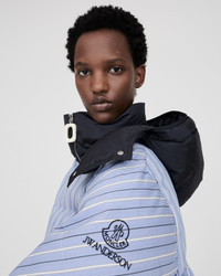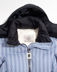 A longstanding collaboration with Moncler returns, reinterpreting technical outerwear through a JW ANDERSON lens. Shirting stripes meet performance, in a down-filled puffer jacket, crafted in Italy. The shape draws inspiration from an archive JW ANDERSON x Moncler collection. Featuring a detachable hood, double-ended zip closure with the signature JW ANDERSON oval puller, and logo embroidery at the sleeve. Finished in a 100% nylon shell with certified goose. down fill. Details - Colour: Mid/Blue - Composition [Main]: 100% Polyester - Composition [Padding]: 100% Down Feathers - Made in: Italy - SKU: JK0426PG1958172