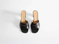 Loafer Mule Heeled Sandal in Black. Crafted in Italy, using smooth nappa leather, this heel features off-white box stitch detailing. Finished with a blind-embossed JWA logo. Designed with a thickened heel for durability, balancing comfort with a refined silhouette. Details - Colour: Black - Composition [Outer]: 100% Full Grain Calf Leather - Composition [Lining]: 100% Split Grain Calf Leather - Composition [Sole]: 100% Split Grain Calf Leather - Made in: Italy - SKU: PU0036LA0071999