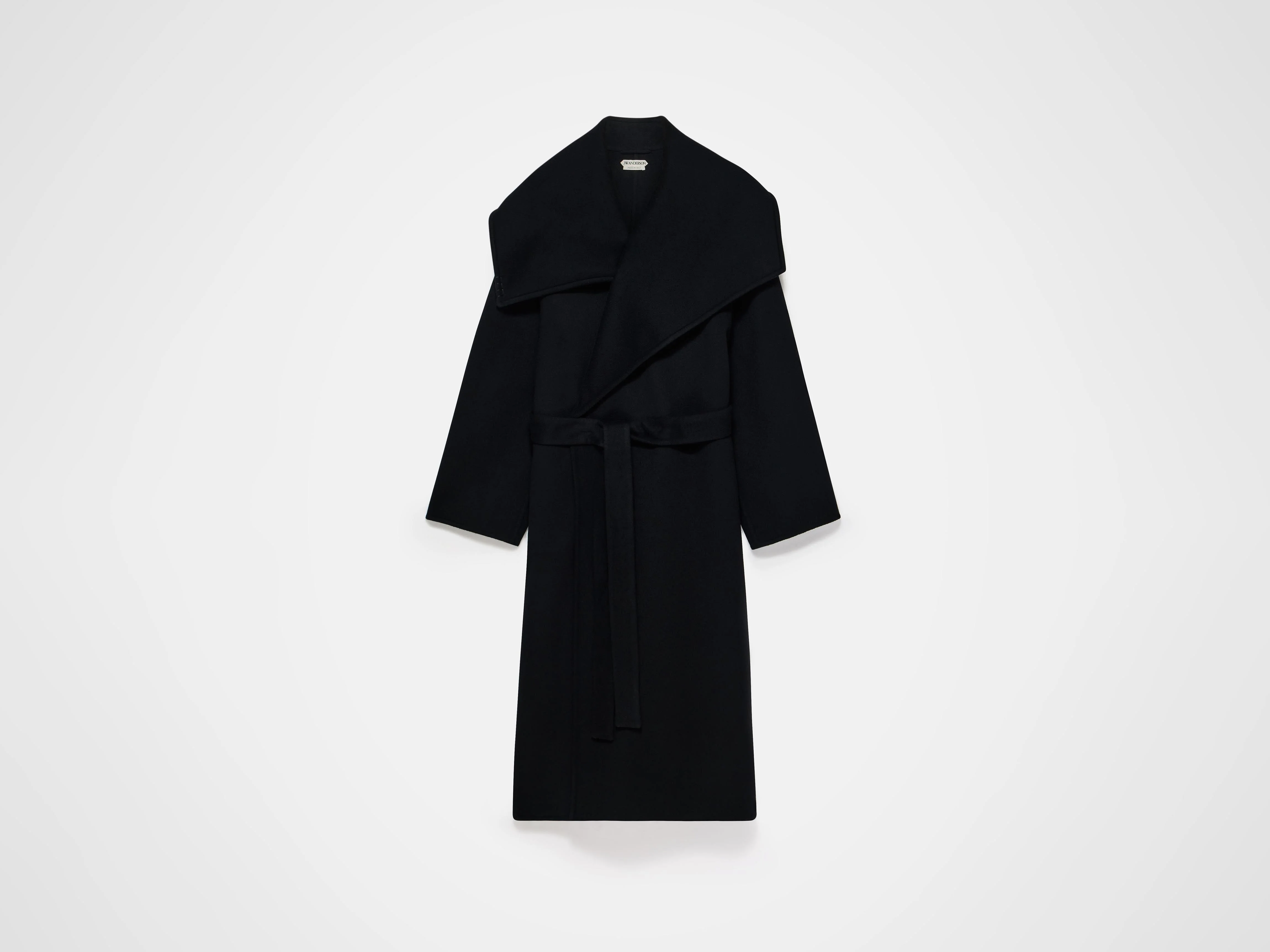 Crafted in Sicily by a specialist double-face factory, this wrap coat is constructed from fabric finished on both sides. The double-face technique involves splitting and hand-finishing the layers together, allowing for clean seams and an unlined interior. Finished with a self-fabric belt fastening for a refined silhouette. Details - Colour: Black - Composition [Main]: 90% Wool, 10% Cashmere - Composition [Lining]: 100% Cupro - Made in: Italy - Model [Wears]: Size 10, 175cm Tall - SKU: CO0334PG1869999