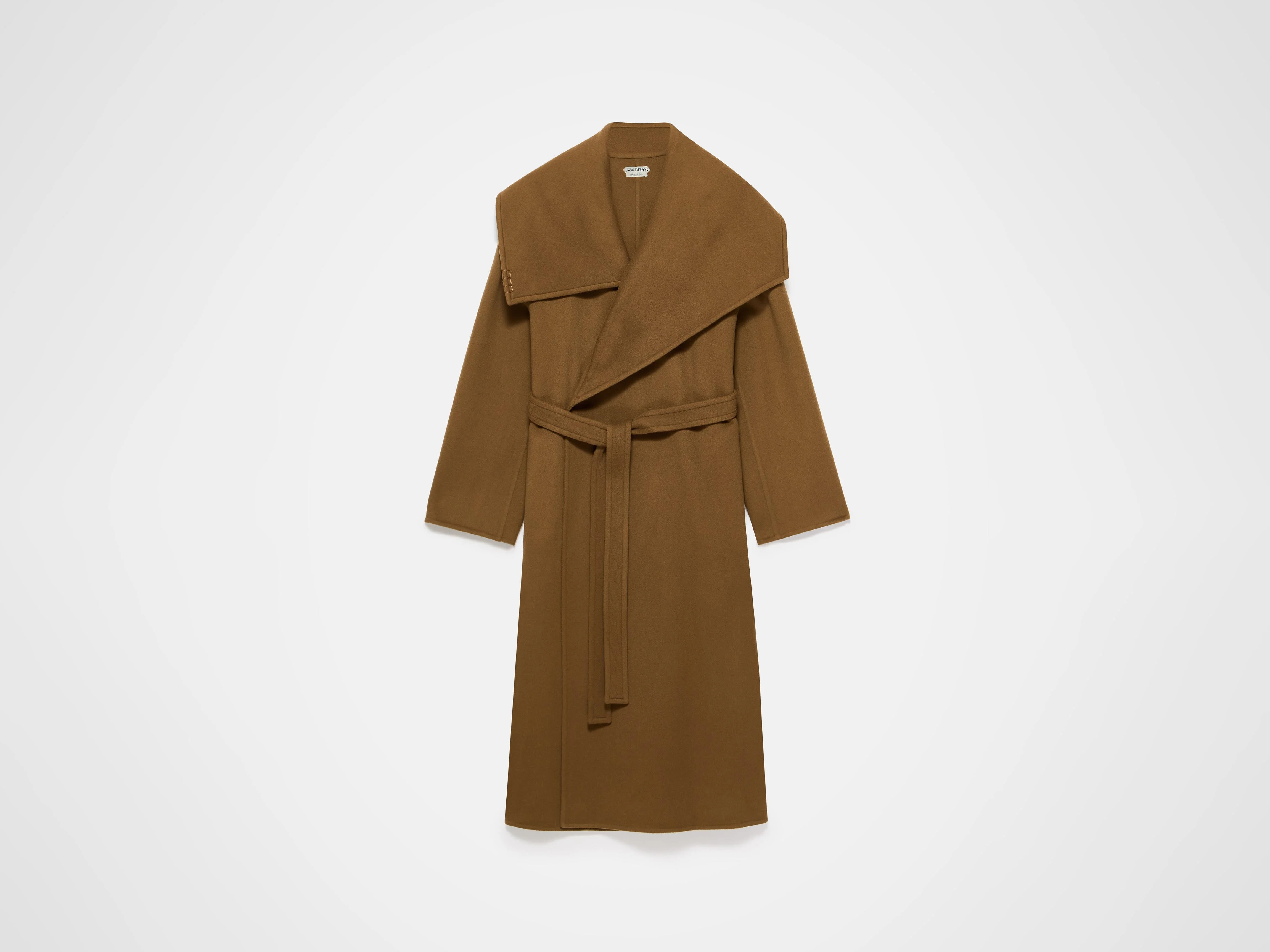 Longline wrap front coat with belt fastening in cumin double-face fabric. Constructed by hand in Sicily by a specialist factory, the seams are split and joined for a clean, low-bulk finish. The fabric is finished on both sides, allowing for an unlined construction that reveals refined craftsmanship throughout. Details - Colour: Cumin - Composition [Main]: 90% Wool, 10% Cashmere - Composition [Lining]: 100% Cupro - Made in: Italy - Model [Wears]: Size 10, 180cm Tall - SKU: CO0334PG1869182