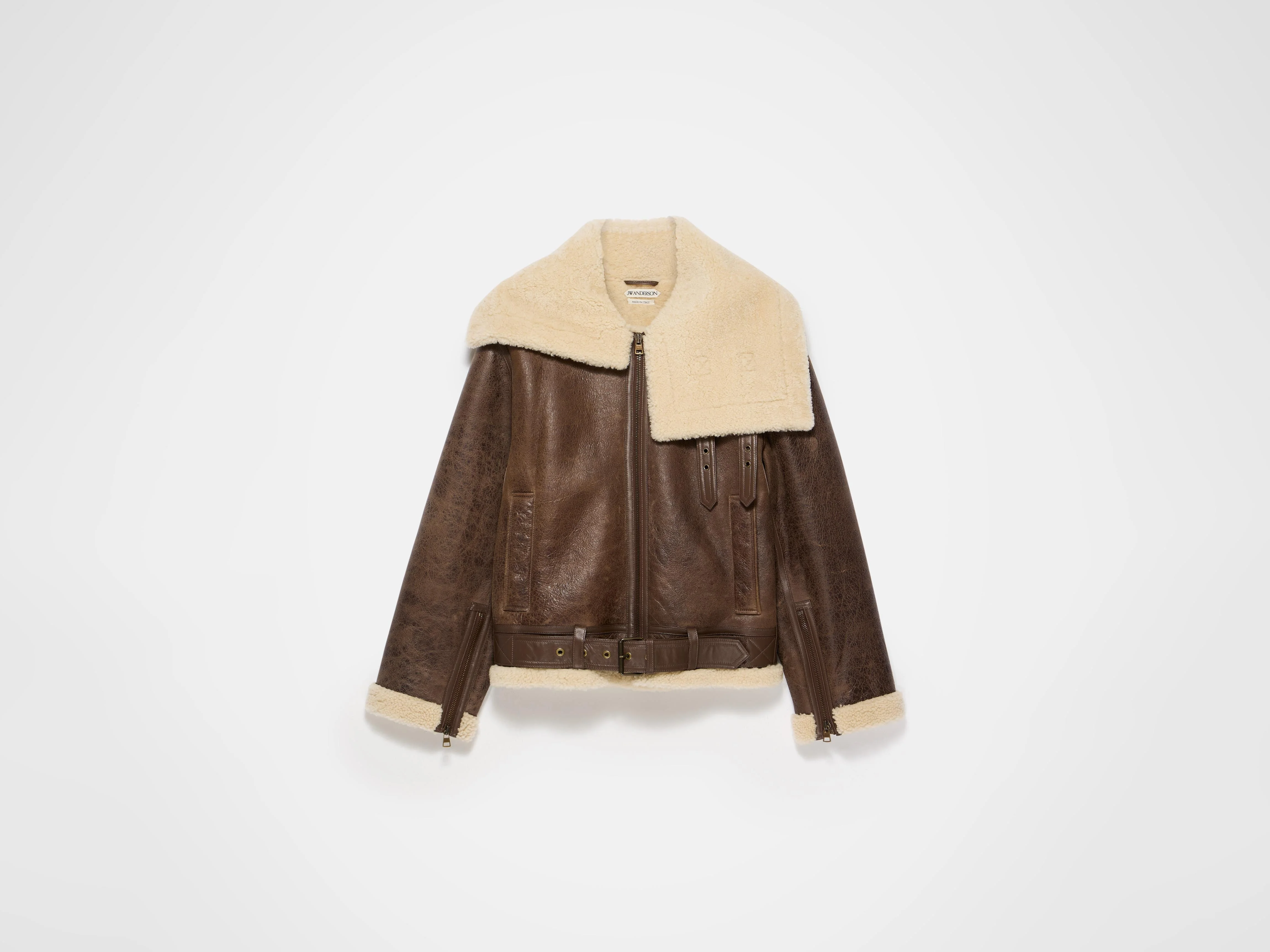 Shearling aviator jacket in brown leather. Features zip openings at the sleeve, antique brass finishing on zips and buckles. Finished with tapes and straps in suede. Details - Colour: Brown/Natural - Composition [Main]: 100% Lambsfur - Made in: Italy - Model [Wears]: Size S, 180cm Tall - SKU: LJ0060LT0125329