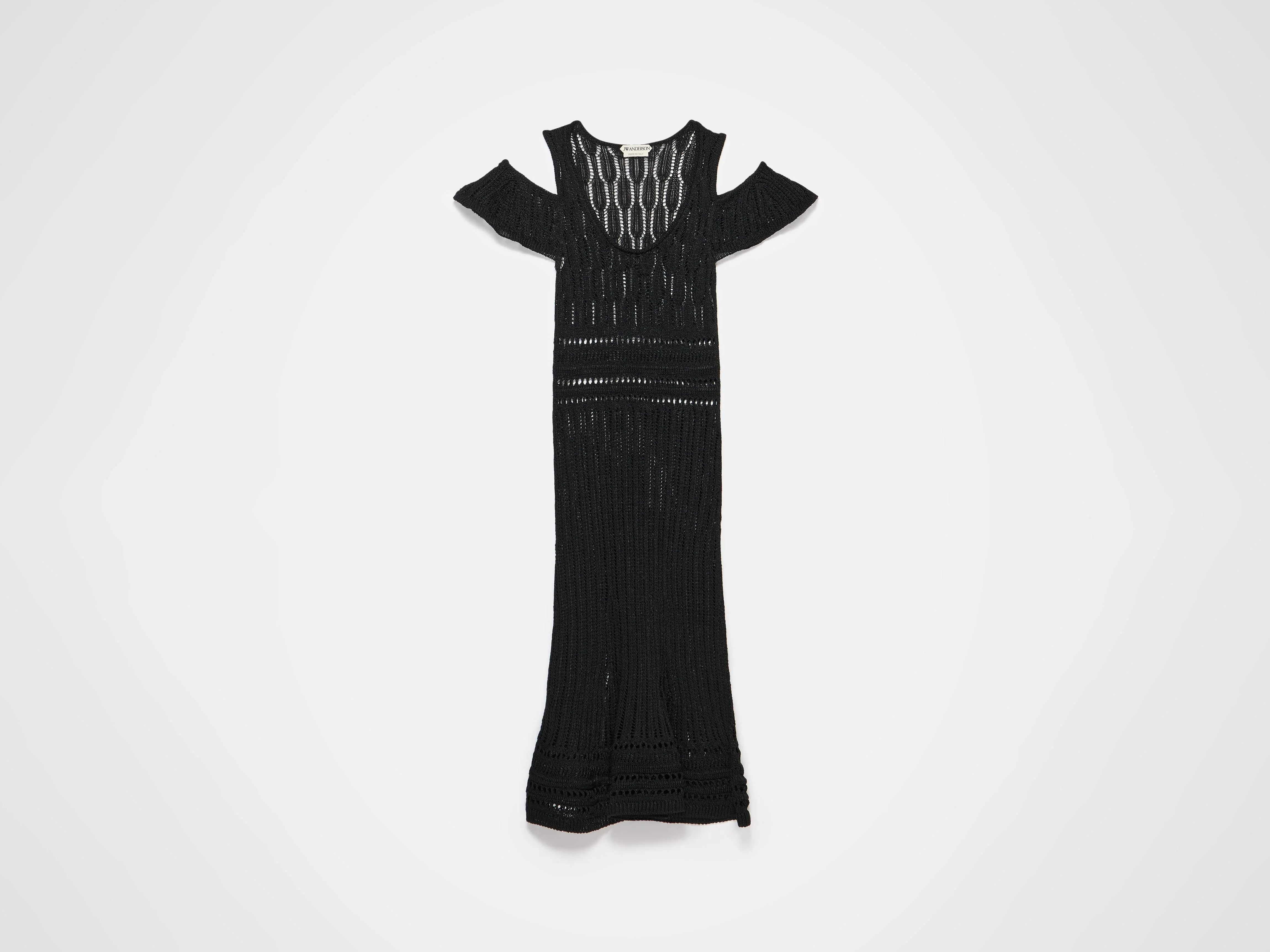 Shoulder ruffle crochet dress in lightweight black yarn. Features a shiny yarn with a silky hand-feel, off-shoulder silhouette and full skirt with internally knitted godets. Finished with off shoulder frill cuff sleeves. Details - Colour: Black - Composition [Main]: 70% Viscose, 30% Pa - Made in: Italy - Model [Wears]: Size S, 180cm Tall - SKU: KW1483YN0489999