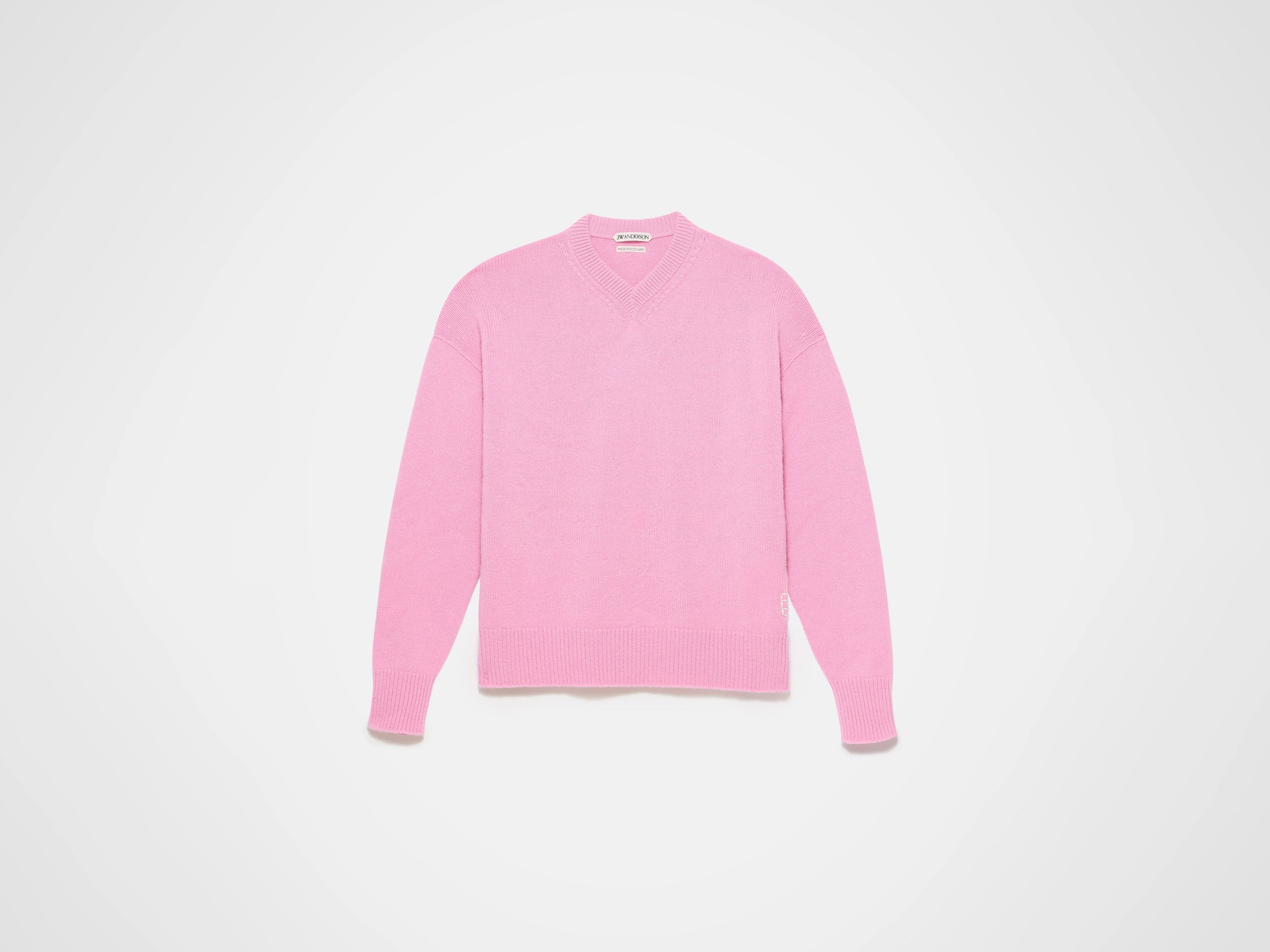 V-neck cashmere jumper in bubblegum mid-weight yarn featuring seamless construction with hand-applied loafer stitch branding. Details - Colour: Bubblegum - Composition [Main]: 100% Cashmere - Made in: Scotland - Model [Wears]: Size L, 175cm Tall - SKU: KW1553YN0472340
