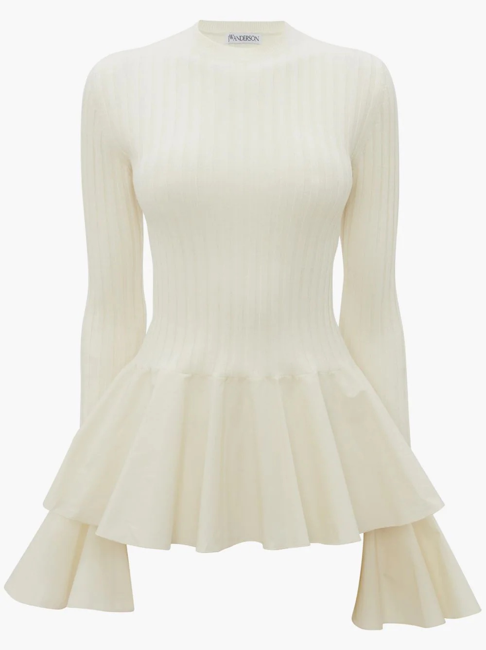 - Fitted silhouette - Crew neckline - Ribbed quality - Fluted woven sleeve and hem detail - 6x6 rib stitch Details - Composition: 100% Wool - 14GG - Light weight - Sleeve length: 87cm - Centre back length: 66cm - Yarn from China"