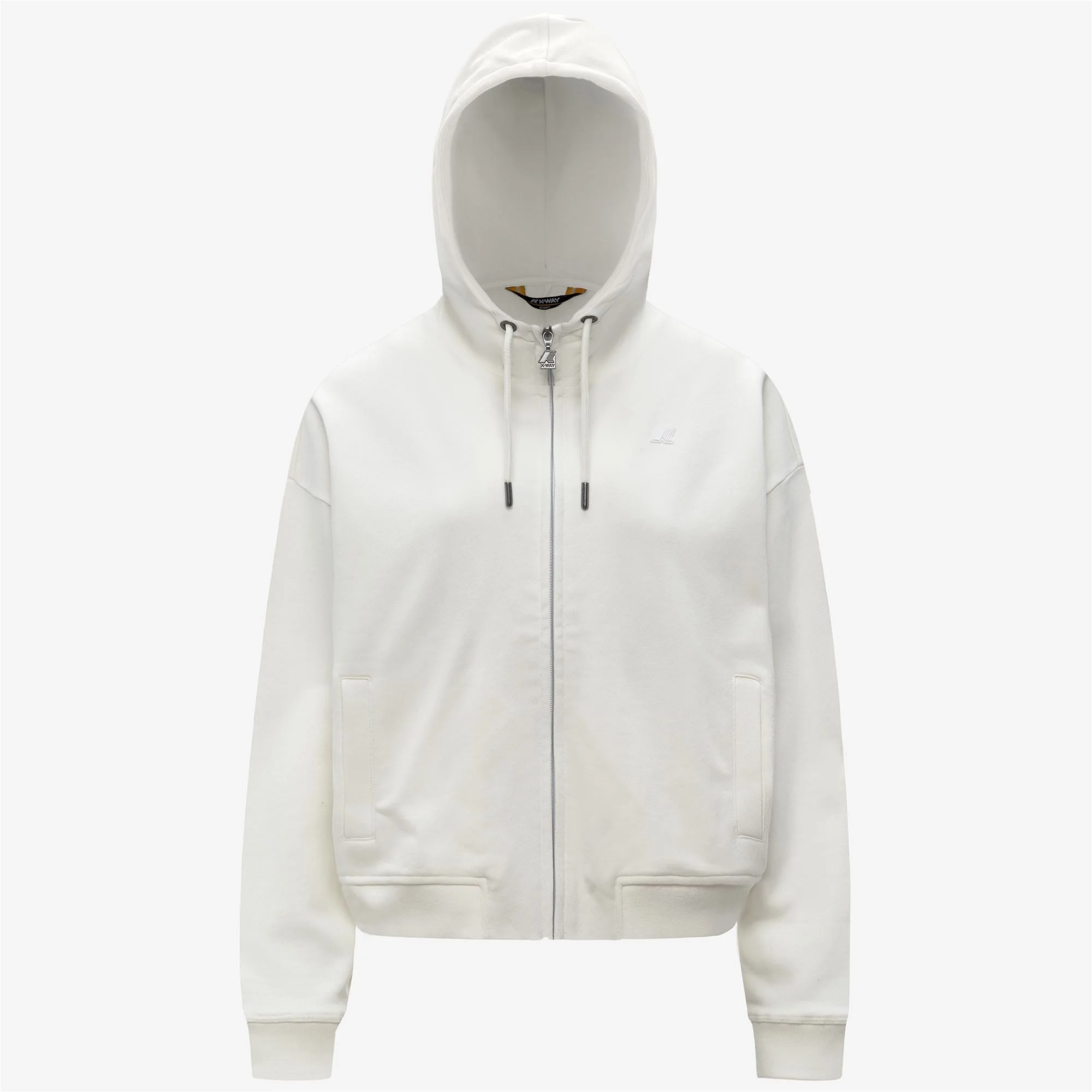 White Women's Fleece Jacket with Hood and Pockets Arwen is a women’s sweatshirt with an athleisure-inspired look, ideal for sport and relax. Made from soft brushed cotton fleece, it features a hood, zip fastening and stretch trims. The short cut offers comfort and ease of movement. - Peach-feel cotton fleece fabric - Adjustable drawstring hood - Zip fastening - Ribbed cuffs and hem - 2 side pockets - Comfort fit - White silicone logo patch Features Description: Fleece, Jacket Gender: Woman Season: Fall, Winter Composition Entire: 100% Cotton Style: K41339W - Color: X42