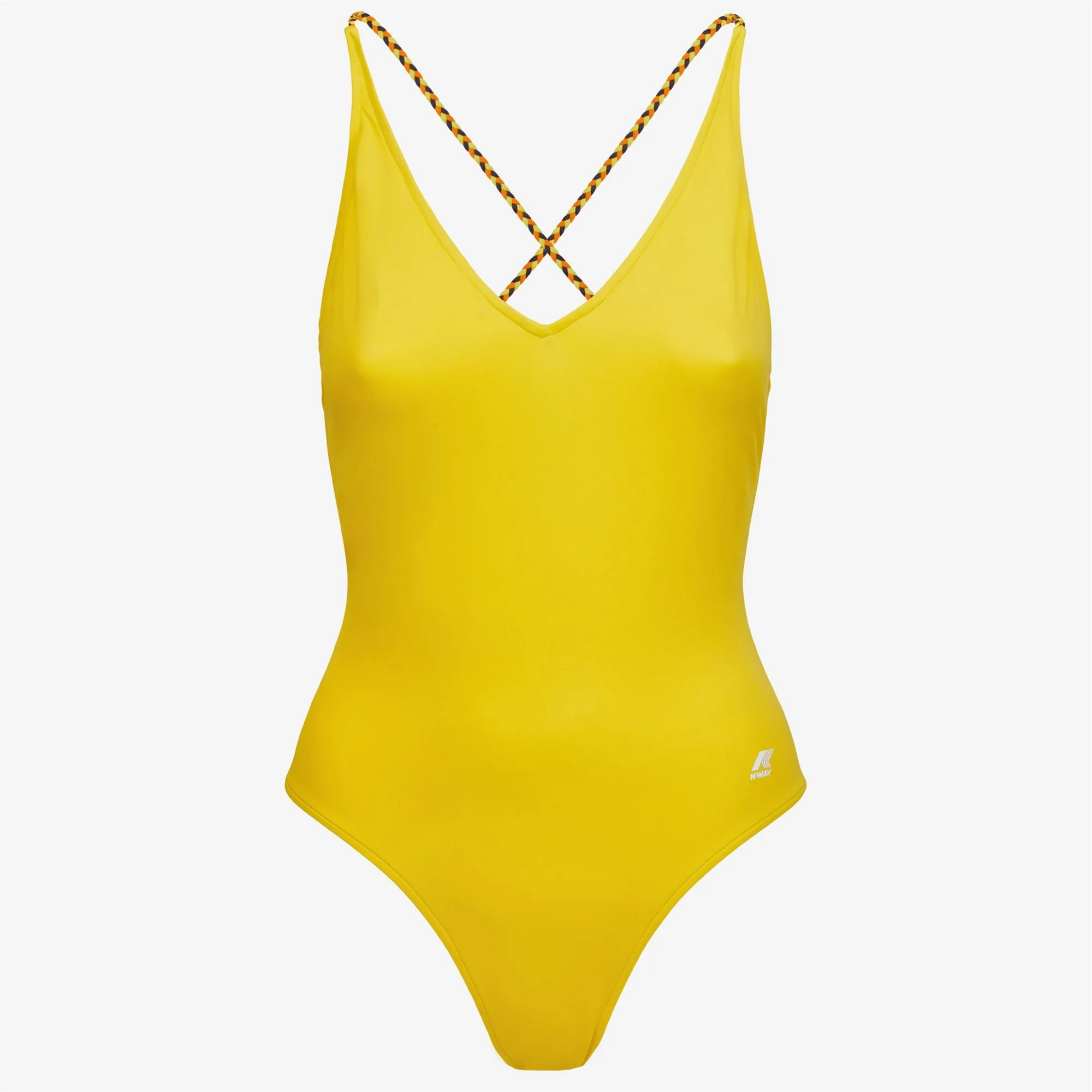Sunstruck Yellow Women's One-Piece Swimsuit with Braided Straps The Crosel one-piece swimsuit flaunts a sleek, feminine silhouette with a V-neck and side logo detail. The back cross-over straps are made from braided fabric in K-Way's iconic colours. - Made from Lycra® - Lined - Braided straps - Regular fit - Printed logo Features Description: Bathing Suits, Swimsuit Gender: Woman Season: Spring, Summer Composition External: 22% Elastane, 78% Recycled Polyamide Lining: 100% Polyester Style: K51234W - Color: XZ7