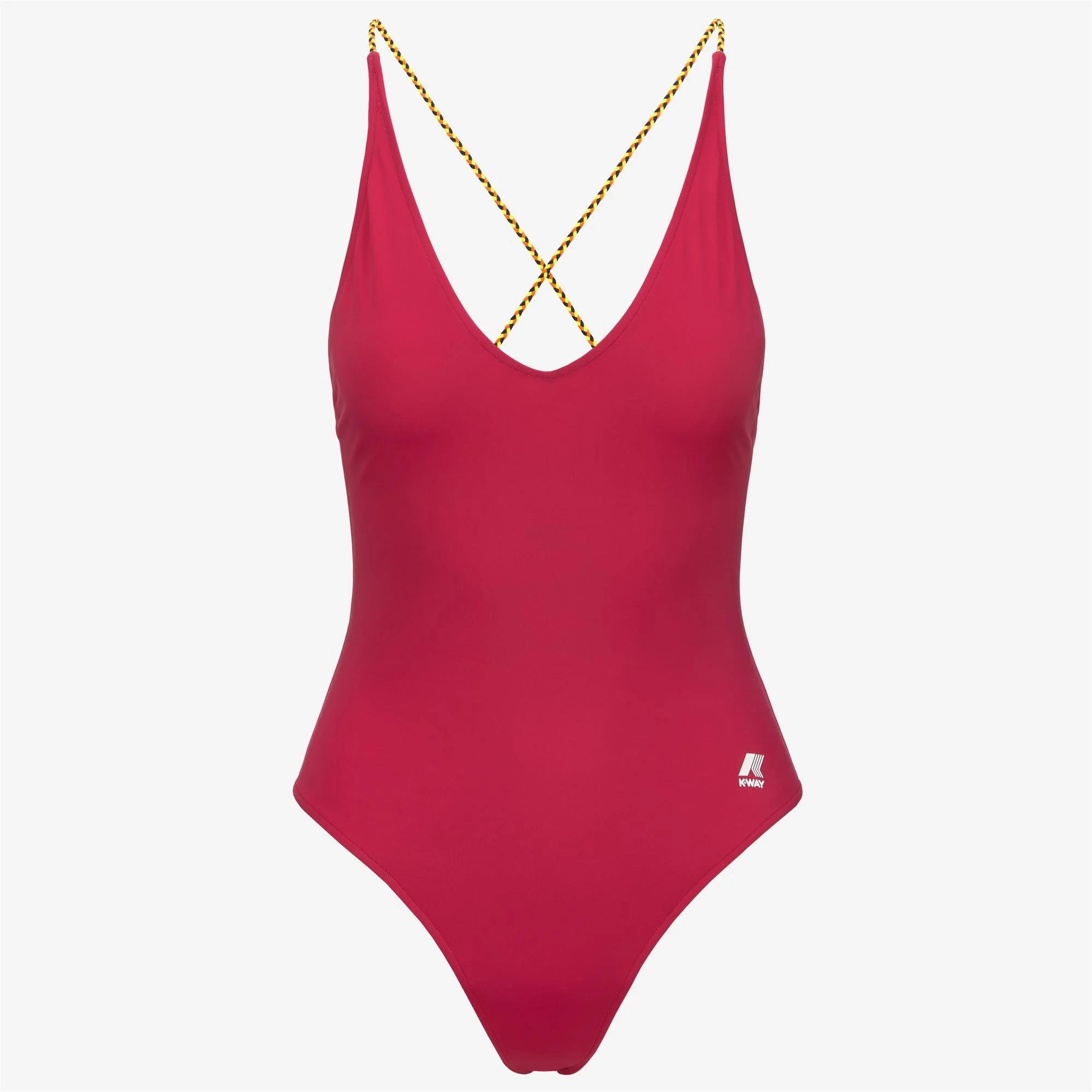 Ruby Red Women's One-Piece Swimsuit with Braided Straps The Crosel one-piece swimsuit flaunts a sleek, feminine silhouette with a V-neck and side logo detail. The back cross-over straps are made from braided fabric in K-Way's iconic colours. - Made from Lycra® - Lined - Braided straps - Regular fit - Printed logo Features Description: Bathing Suits, Swimsuit Gender: Woman Season: Spring, Summer Composition External: 22% Elastane, 78% Recycled Polyamide Lining: 100% Polyester Style: K51234W - Color: V30