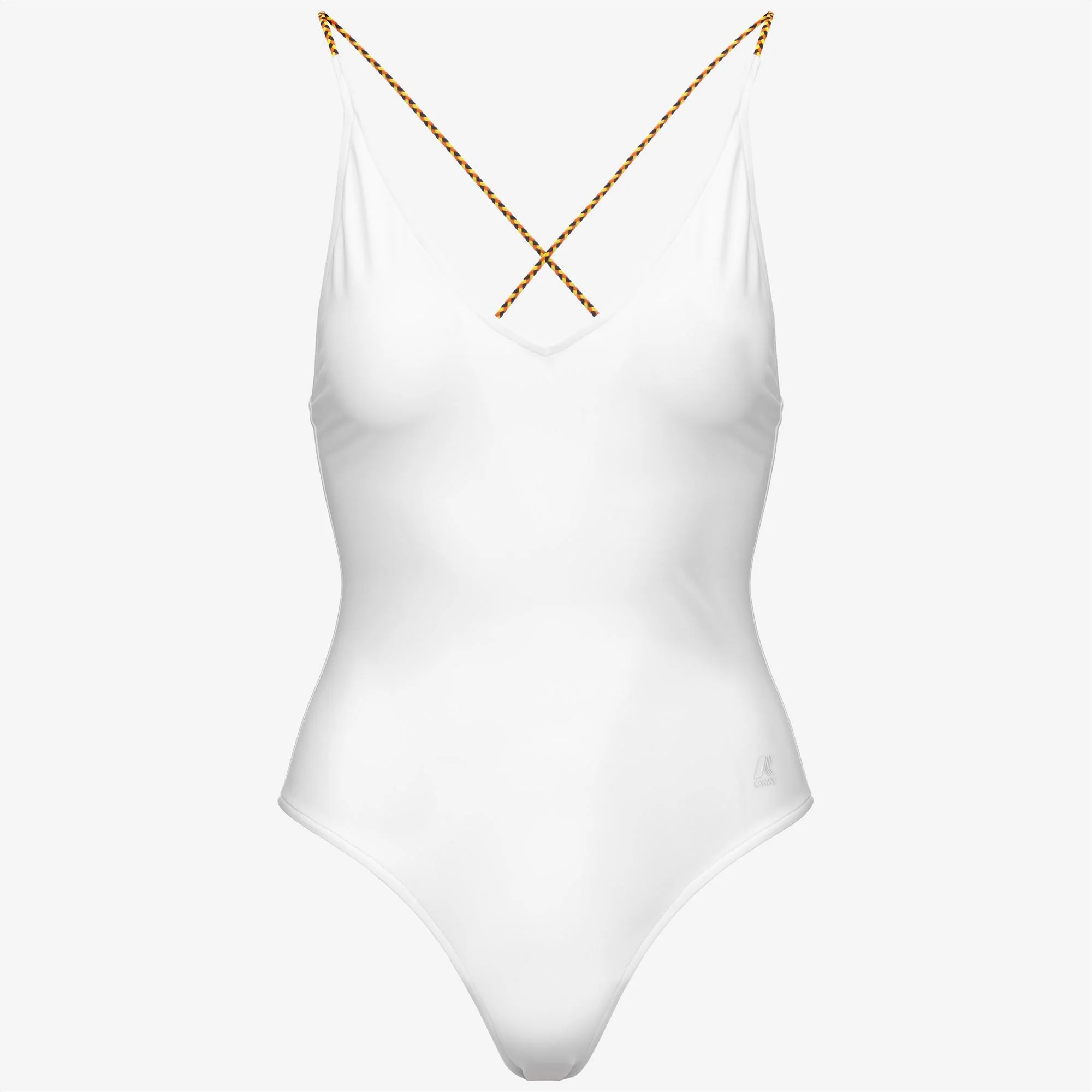 Grey White Women's One-Piece Swimsuit with Braided Straps The Crosel one-piece swimsuit flaunts a sleek, feminine silhouette with a V-neck and side logo detail. The back cross-over straps are made from braided fabric in K-Way's iconic colours. - Made from Lycra® - Lined - Braided straps - Regular fit - Printed logo Features Description: Bathing Suits, Swimsuit Gender: Woman Season: Spring, Summer Composition External: 22% Elastane, 78% Recycled Polyamide Lining: 100% Polyester Style: K51234W - Color: 001