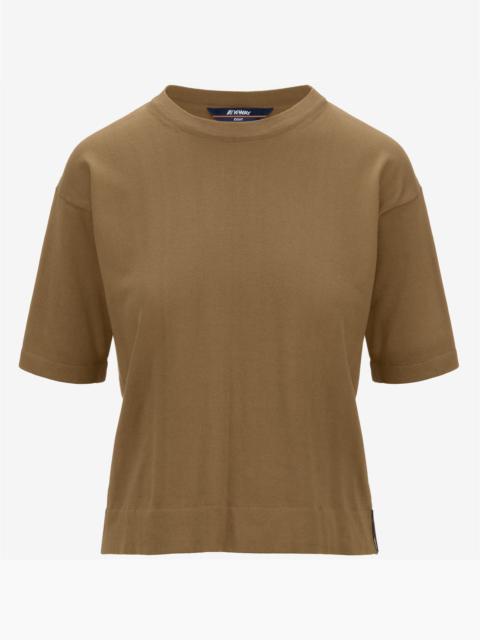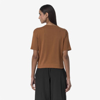 Brown Orange Women's Cropped Knit Pullover Sweater for City Wear Esmer is a women's short-sleeved crewneck sweater with a classic design and a regular fit, crafted from anti-pilling Egyptian cotton yarn known for its soft and smooth texture. This lightweight knitwear piece is characterized by its slightly cropped, feminine cut and features a crew neck and single fold hems. - Anti-pilling cotton yarn - Plain knit - Crew neck - Regular fit - Striped logo on hem Features Description: KNITWEAR, Pull Over Gender: Woman Season: Spring, Summer Composition Entire: 100% Cotton Style: K4126PW - Color: WGF