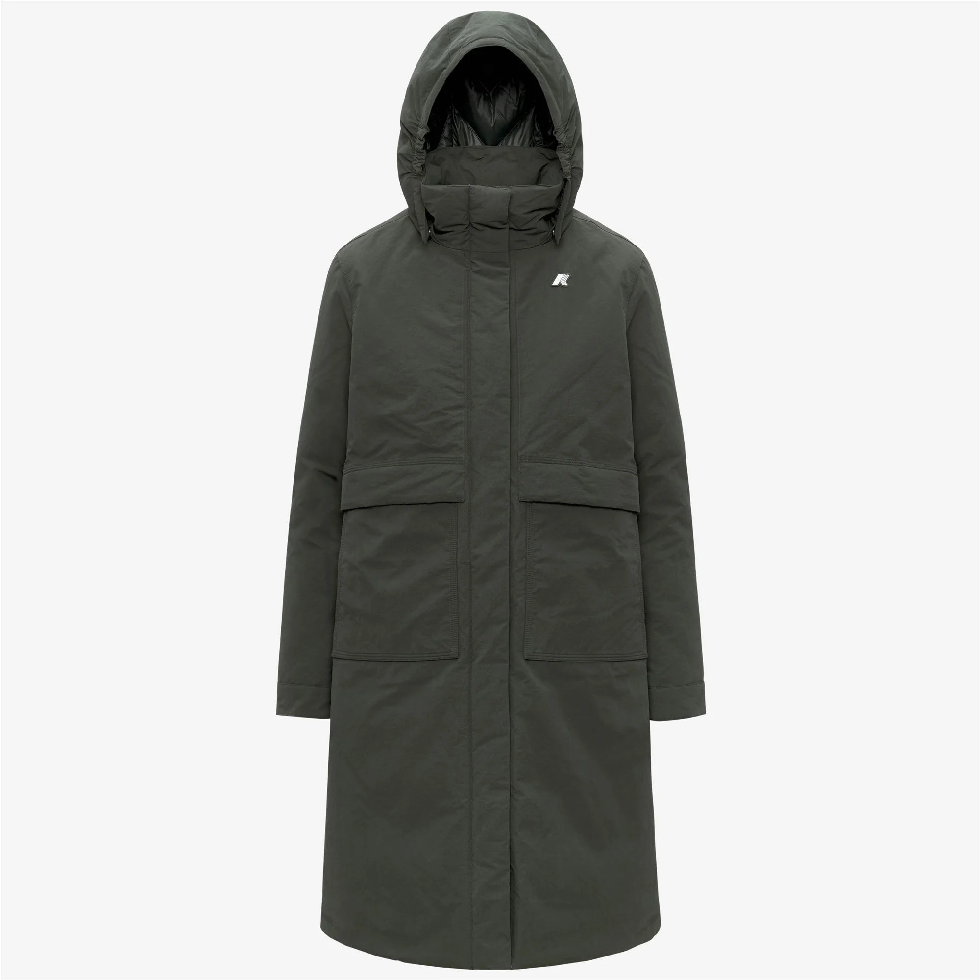 Green black Women's Long A-Line Jacket with PrimaLoft Insulation Kalisha is a women’s long A-line jacket, designed for transitional seasons and early cold spells. Made from a water-repellent, windproof nylon-cotton blend and padded with PrimaLoft® insulation, it offers reliable protection in unpredictable weather. Details include a covered zip fastening, an enveloping high collar, a detachable hood, and generous pockets. - Water-repellent and windproof nylon-cotton blend fabric - Medium-weight PrimaLoft® padding - Herringbone quilted lining - Glossy nylon lining - Medium/high warmth rating - High collar - Detachable hood - Flared, adjustable hem - Zip fastening with protective flap - Double-entry patch pockets - 2 inner pockets with concealed zip - Triple-needle stitching - Regular fit - White silicone logo patch Features Description: Jackets, Long Gender: Woman Season: Fall, Winter Composition External: 30% Cotton, 70% Nylon Lining: 100% Nylon Padding: 100% Recycled Polyester Style: K41462W - Color: WMR
