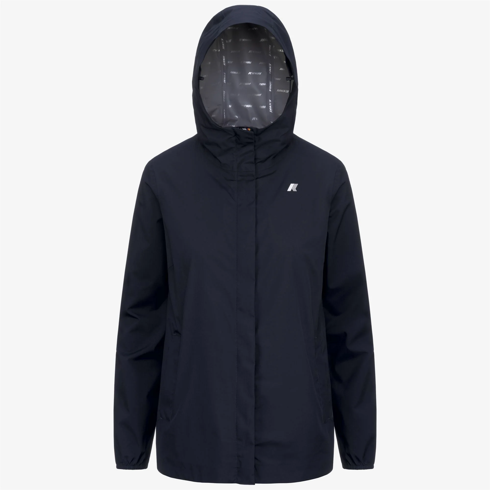 Blue Women's Stretch Waterproof Jacket for Variable Weather Marguerite is a women's medium-length jacket, perfect for transitional seasons. It's crafted from stretch technical fabric that allows for unrestricted movement while providing rain and wind protection, with water resistance up to 10000 mm. The interior is lined with an insulating membrane with all-over silver-tone K-Way lettering print. Functional details, such as zipped pockets, a wrap-around adjustable hood, and elasticated cuffs and hem ensure an easy, comfortable fit. - Waterproof, windproof and breathable stretch polyester fabric - DWR (Durable Water Repellent) treatment - Water resistance: 10000 mm water column - Logo-printed interior membrane - Heat-taped seams - Adjustable drawstring hood - Flap-covered zip fastening - Elasticated cuffs - 2 zipped pockets - Regular fit - White printed logo Features Description: Jackets, Mid Gender: Woman Season: Spring, Summer, Fall, Winter Style: K31382W - Color: K89