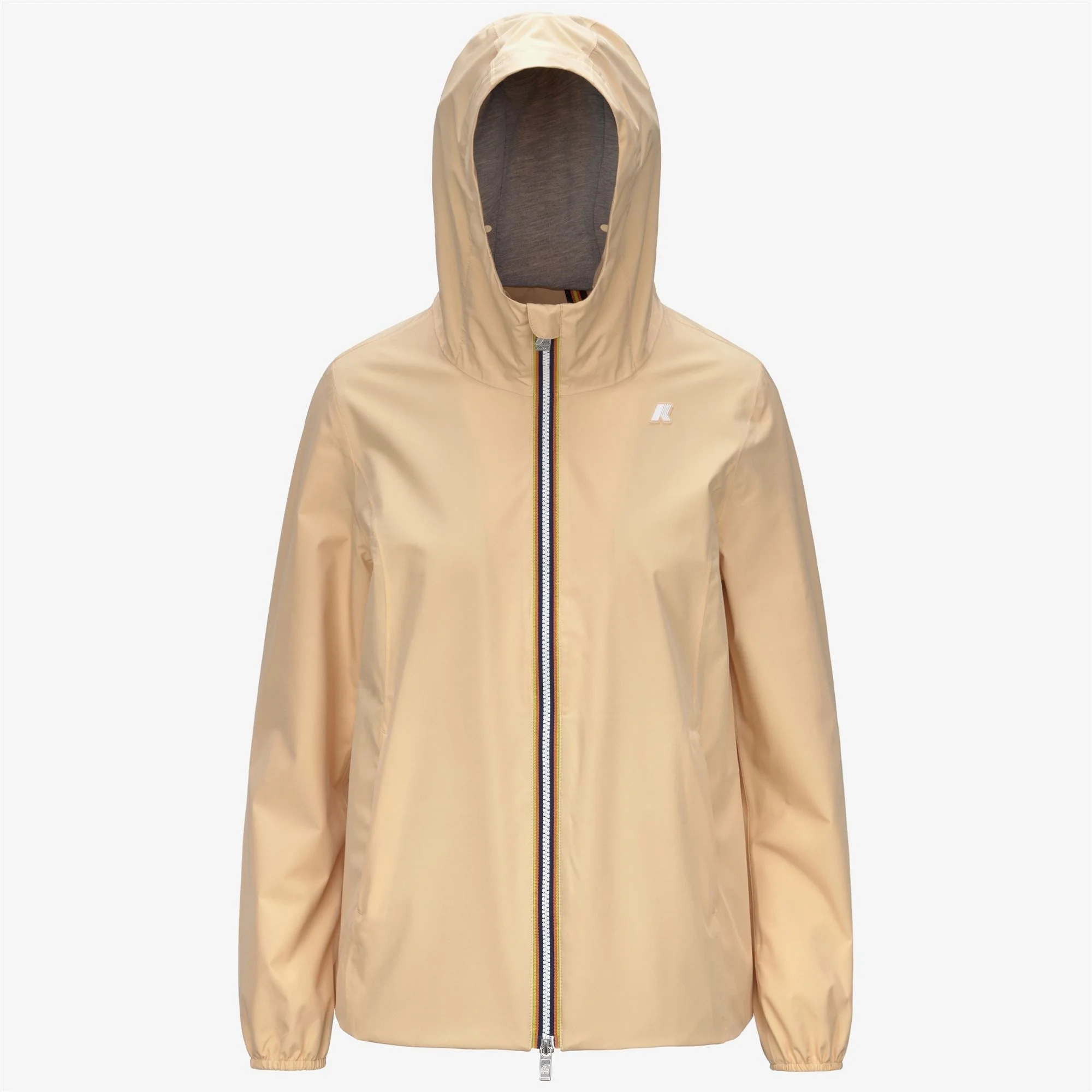 Beige Orange Women's Mid-Season Waterproof Jacket Marguerite is a women's short jacket offering a mid-season warmth grade. It boasts a casual, modern look, and is made from stretch polyester with a waterproof and windproof coating plus a soft grey melange cotton jersey lining. The inner heat-taped seams and the waistband decorated with the iconic multicoloured K-Way tape provide a distinctive signature touch. - Waterproof, windproof, breathable stretch polyester fabric - Cotton jersey lining - Heat-taped seams - Non-detachable hood - Zip closure - Elasticated cuffs - Adjustable bottom hem - 2 zipped pockets - Ventilation cut-out on the back - Regular fit - White silicone logo Features Description: Jackets, Mid Gender: Woman Season: Spring, Summer Composition External: 100% Polyester Lining: 100% Cotton Shell Fabric A External: 100% Polyester Lining A: 35% Cotton, 65% Polyester Shell Fabric B External: 100% Poliuretane Lining B: 100% Nylon Style: K8138PW - Color: W6I