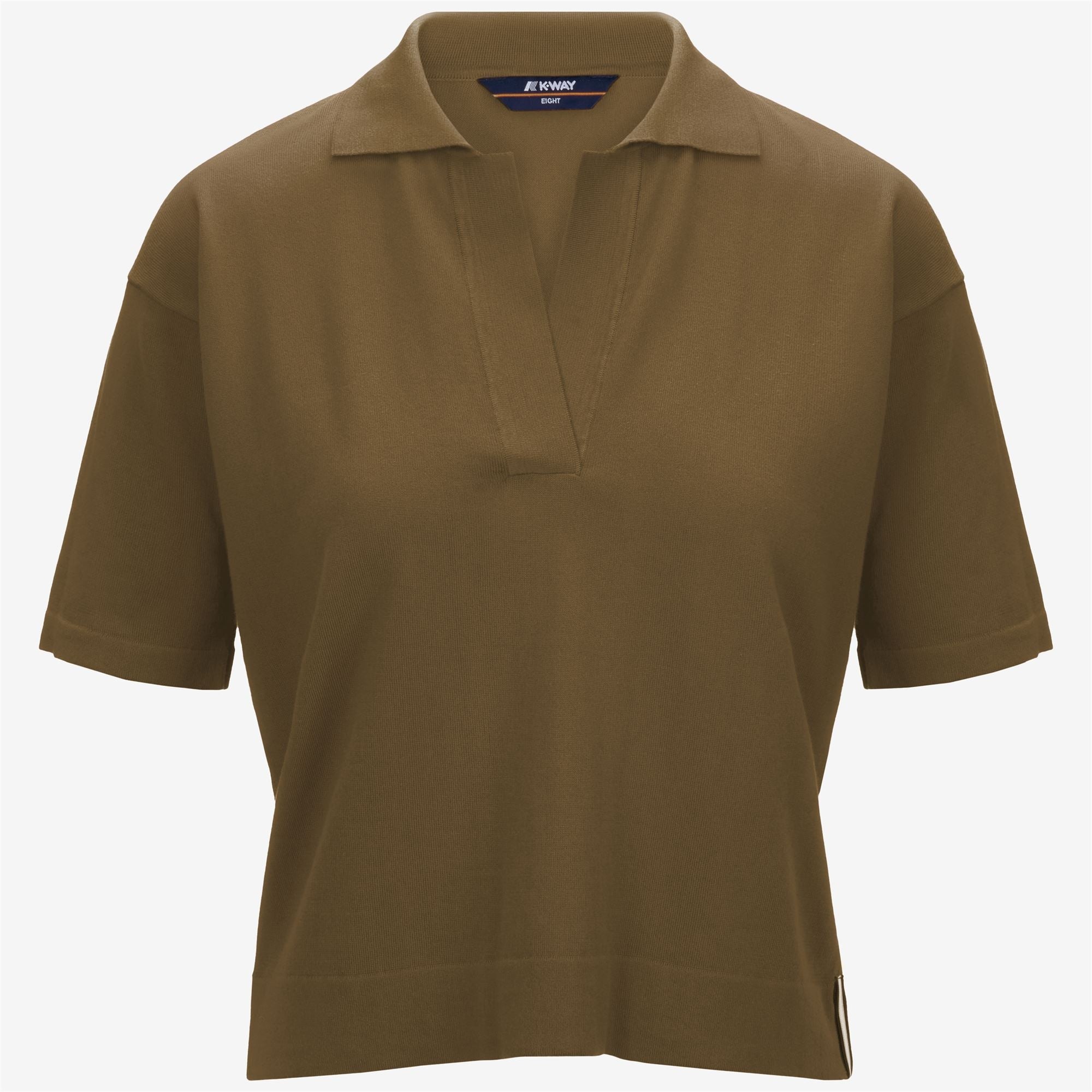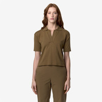 Brown Women's Classic Knit Polo Shirt for City Wear Marlhes is a short-sleeved women's polo shirt with a classic design and a regular fit, crafted from anti-pilling Egyptian cotton yarn known for its soft and smooth texture. This lightweight knitwear piece is characterized by its slightly cropped, feminine cut and features a polo collar with a button placket, and single fold hems. - Anti-pilling cotton yarn - Plain knit - Polo collar - Regular fit - Striped logo on hem Features Description: KNITWEAR, Polo Gender: Woman Season: Spring, Summer Composition Entire: 100% Cotton Style: K4123RW - Color: 045